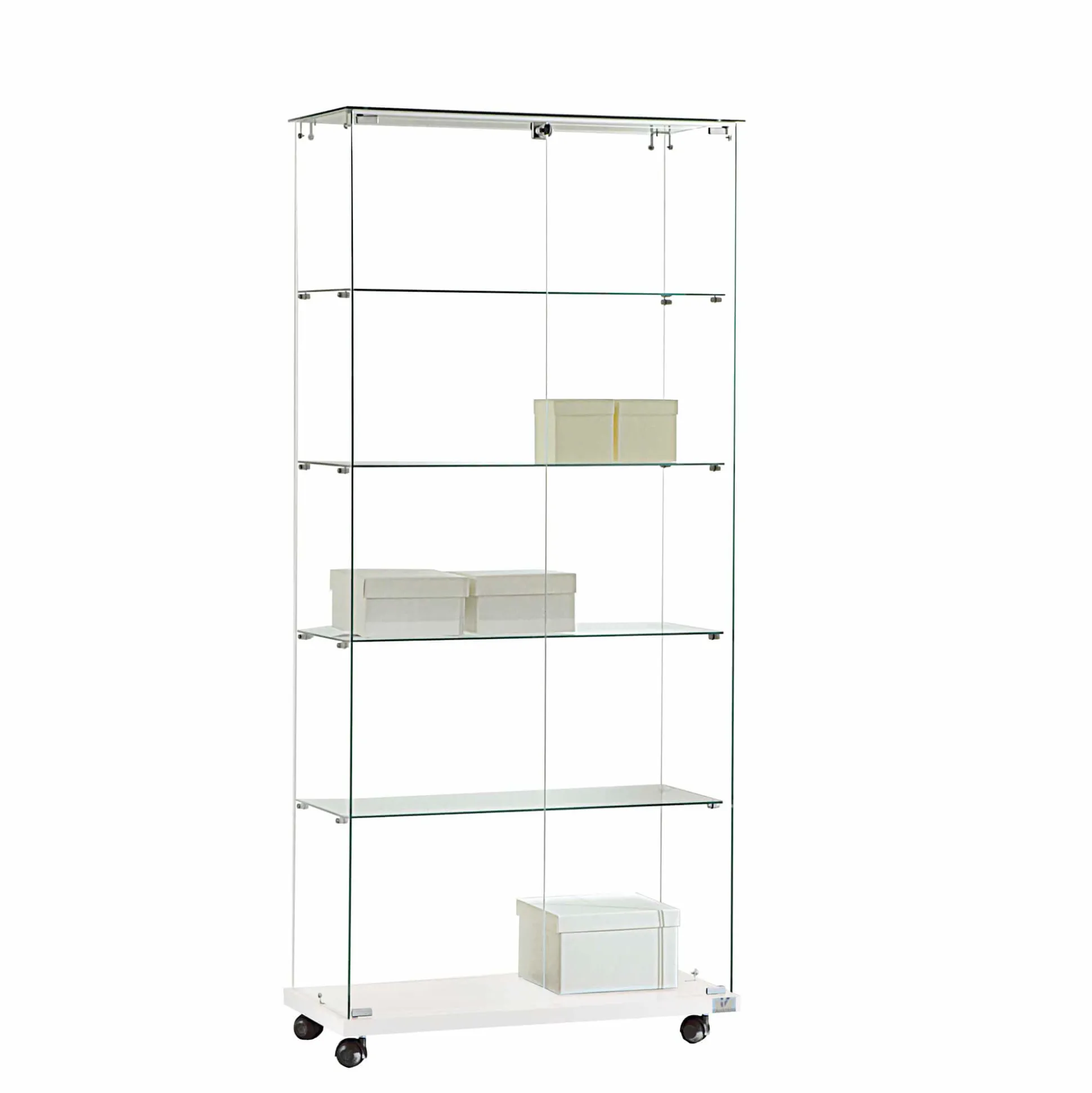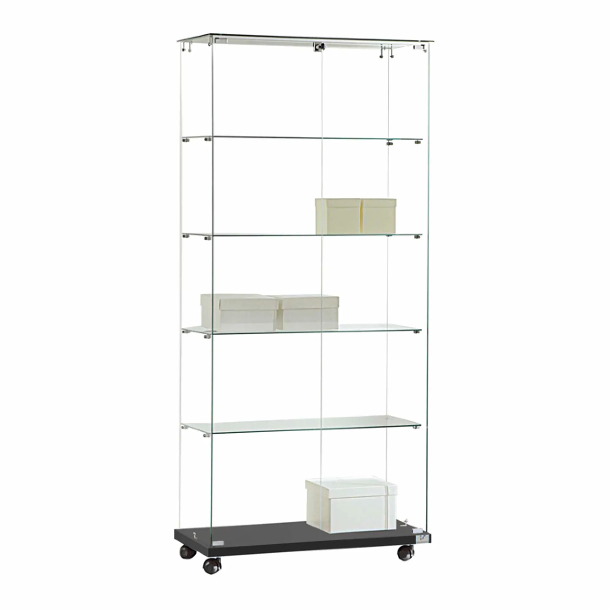 Denne vitrine er en del af serien af glasvitriner, som består af smalle og brede vitriner med og uden lys, de er med hvid bundhylde med hjul. De er til hurtig levering. Se dem alle her.
