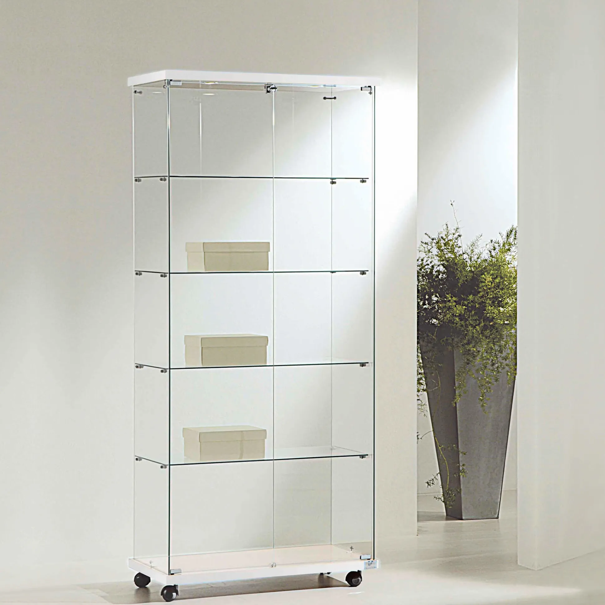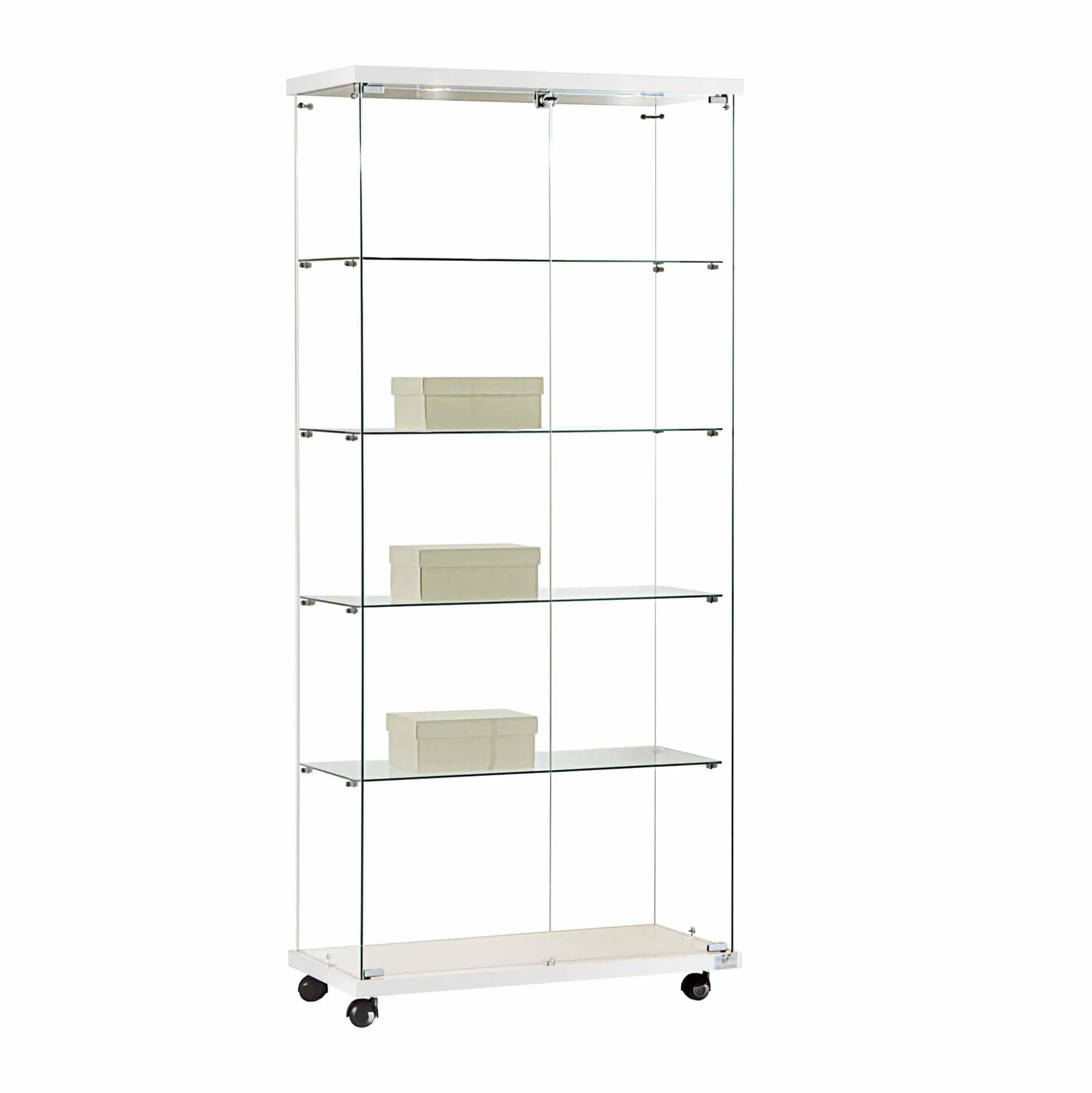 Denne vitrine er en del af serien af glasvitriner, som består af smalle og brede vitriner med og uden lys, de er med hvid bundhylde med hjul. De er til hurtig levering. Se dem alle her.
