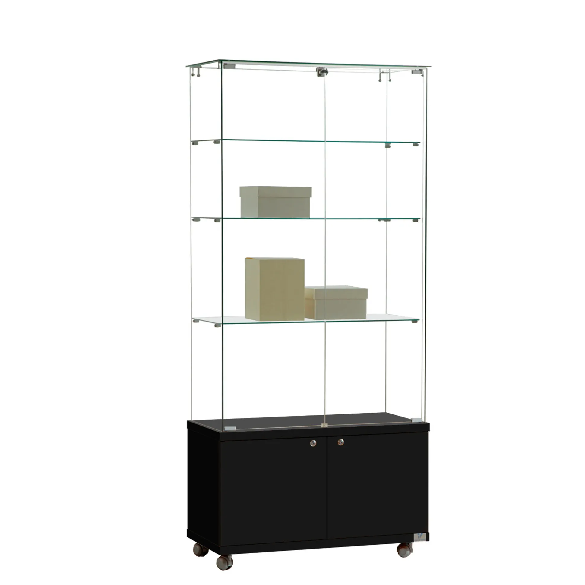 Glasvitrine/glasmontre i hærdet glas, 3 glashylder og låsbare låger og underskab.