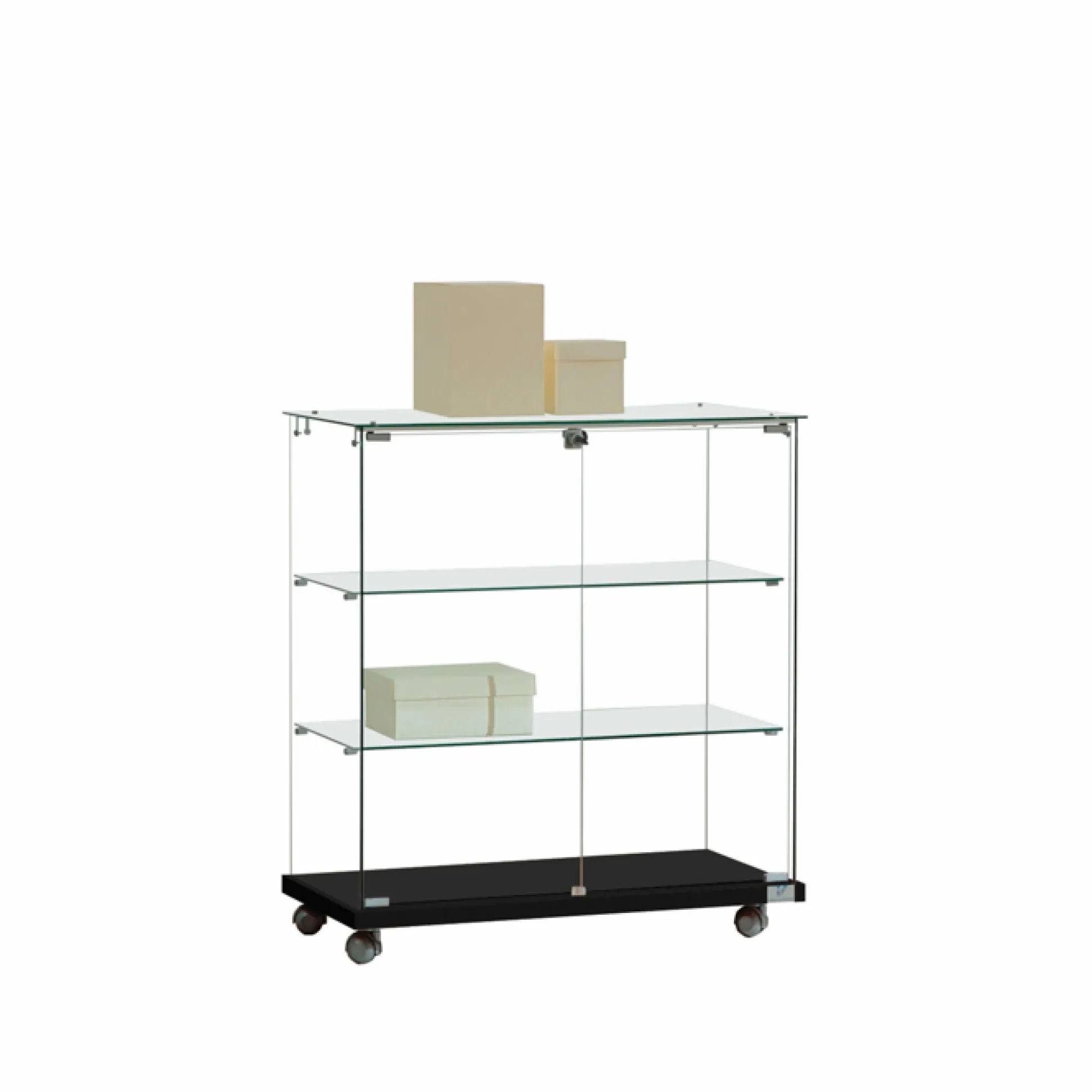 Vitrinen er med låsbare glaslåger, 2 glashylder der kan klarer belastning 10 kg. fordelt på hylden. Glasvitrinen er med glastop og sort eller hvid bund med hjul.