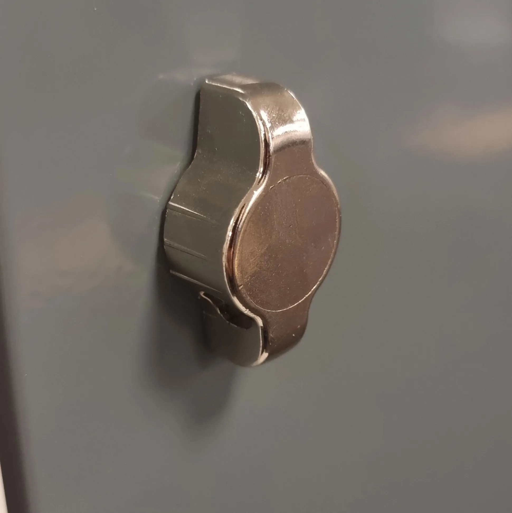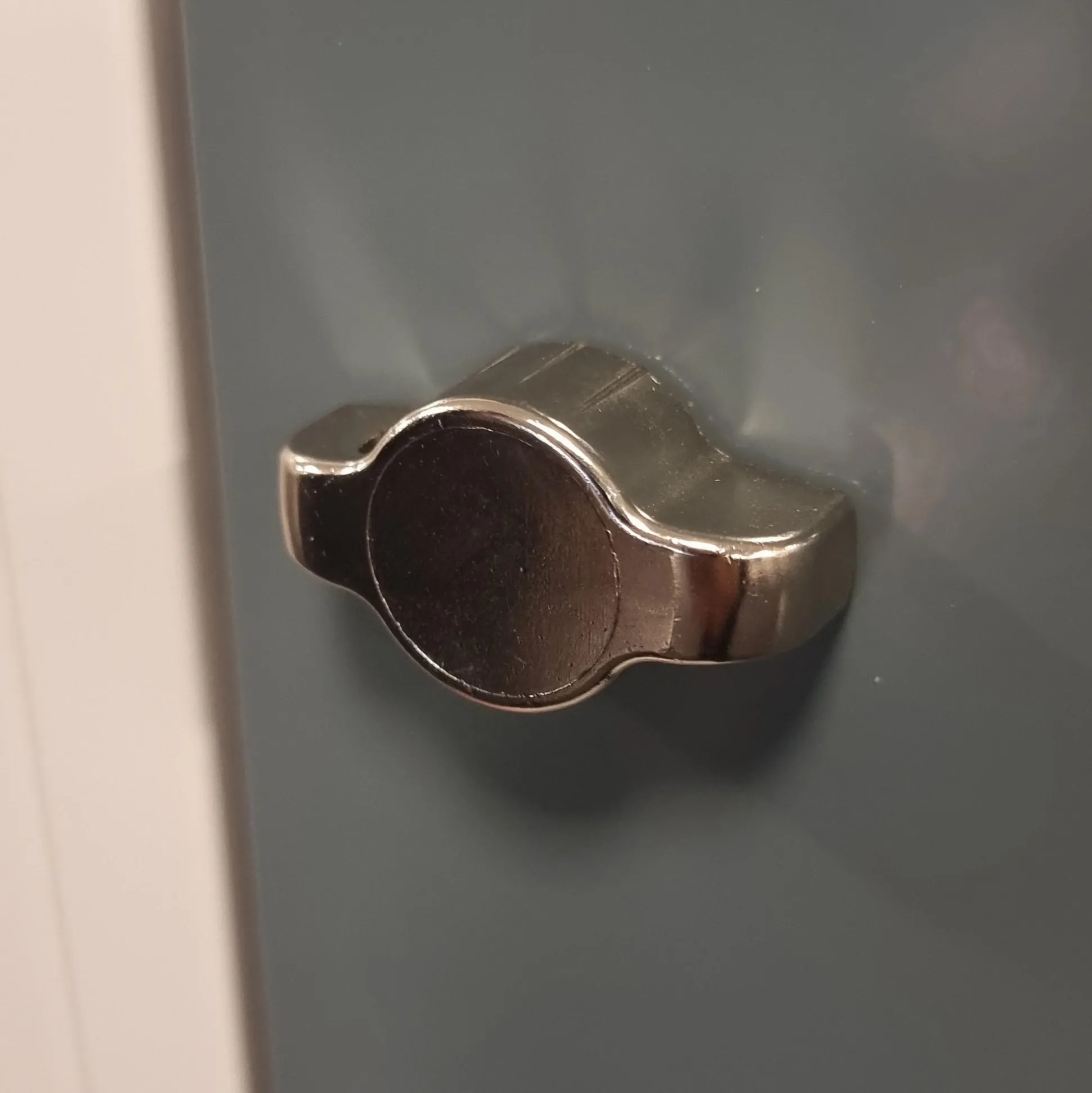 Greb for hængelås til Newline omklædningsskabe. Til max. 6 mm. hængelåse. Ekskl. hængelås. Kan nemt skiftes fra cylinderlås til dette greb, med møtrik på lågens bagside.