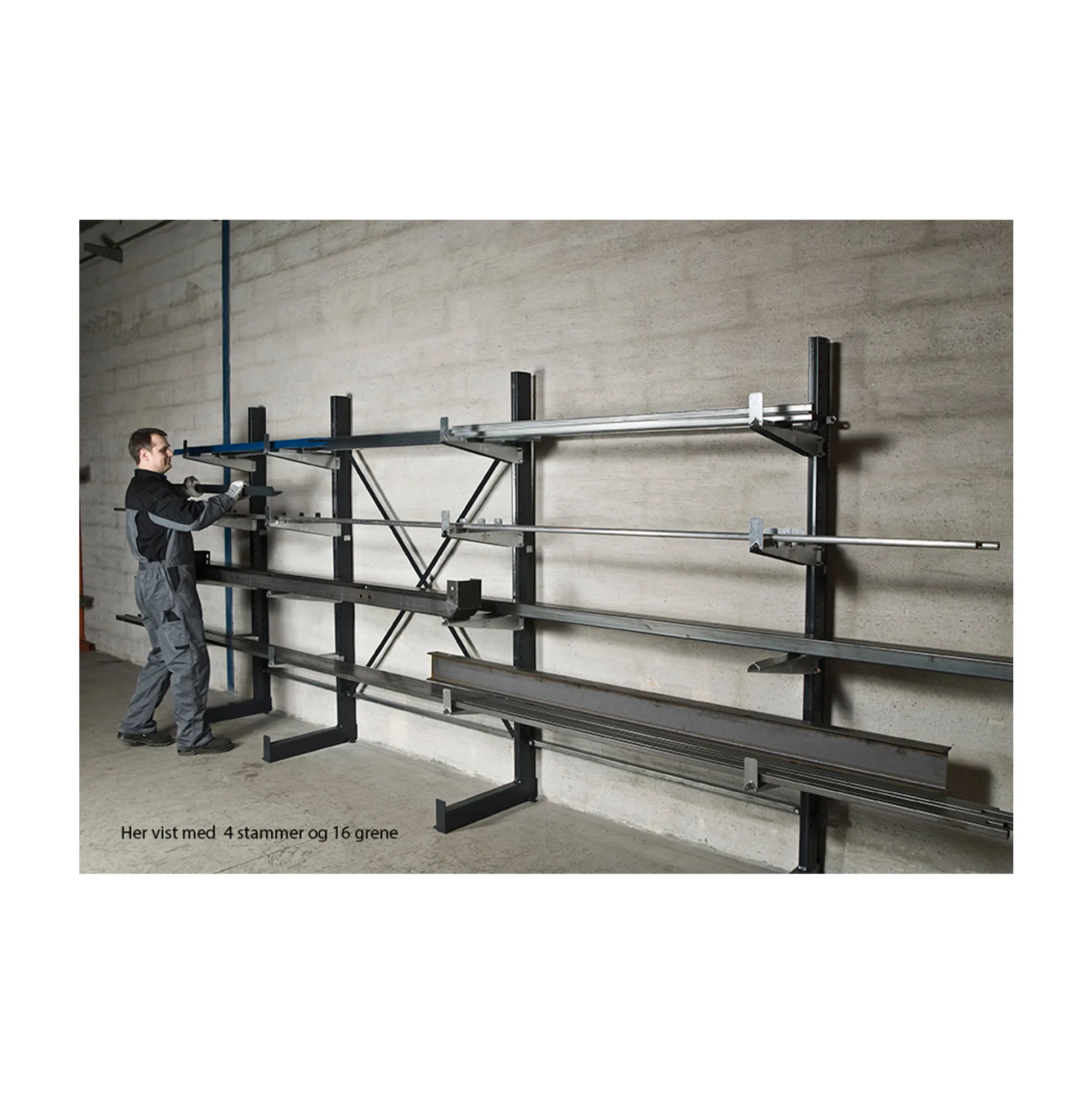 Grenreol model 20. Enkeltsidet. 5 bærelag (inkl. stamme). Består af: 3 enkeltstammer á 2600/600 * 1 krydsafstivning á 3/1500 mm * 12 pladegrene á 600 mm. I alt 4 bærearme. Reolerne leveres lakeret RAL 7016, antracitgrå. Der kan yderligere leveres løse endestop og hylder.