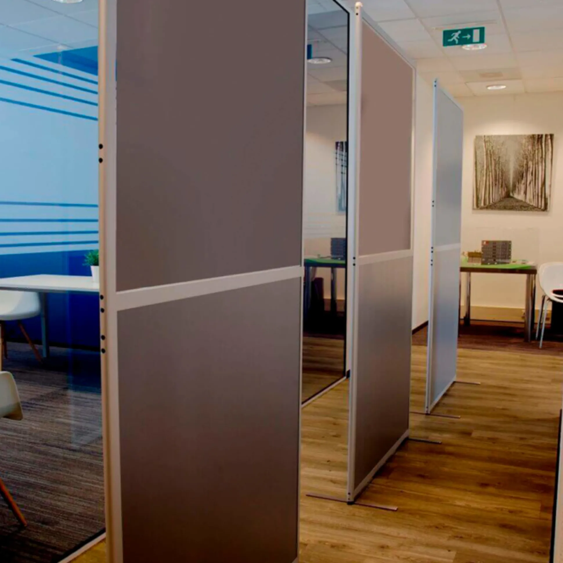 Disse skærme kan benyttes til kø-styrring, afskærmning og opdeling af rum. Der sidder beslag i toppen, til at kunne koble flere skærme sammen.