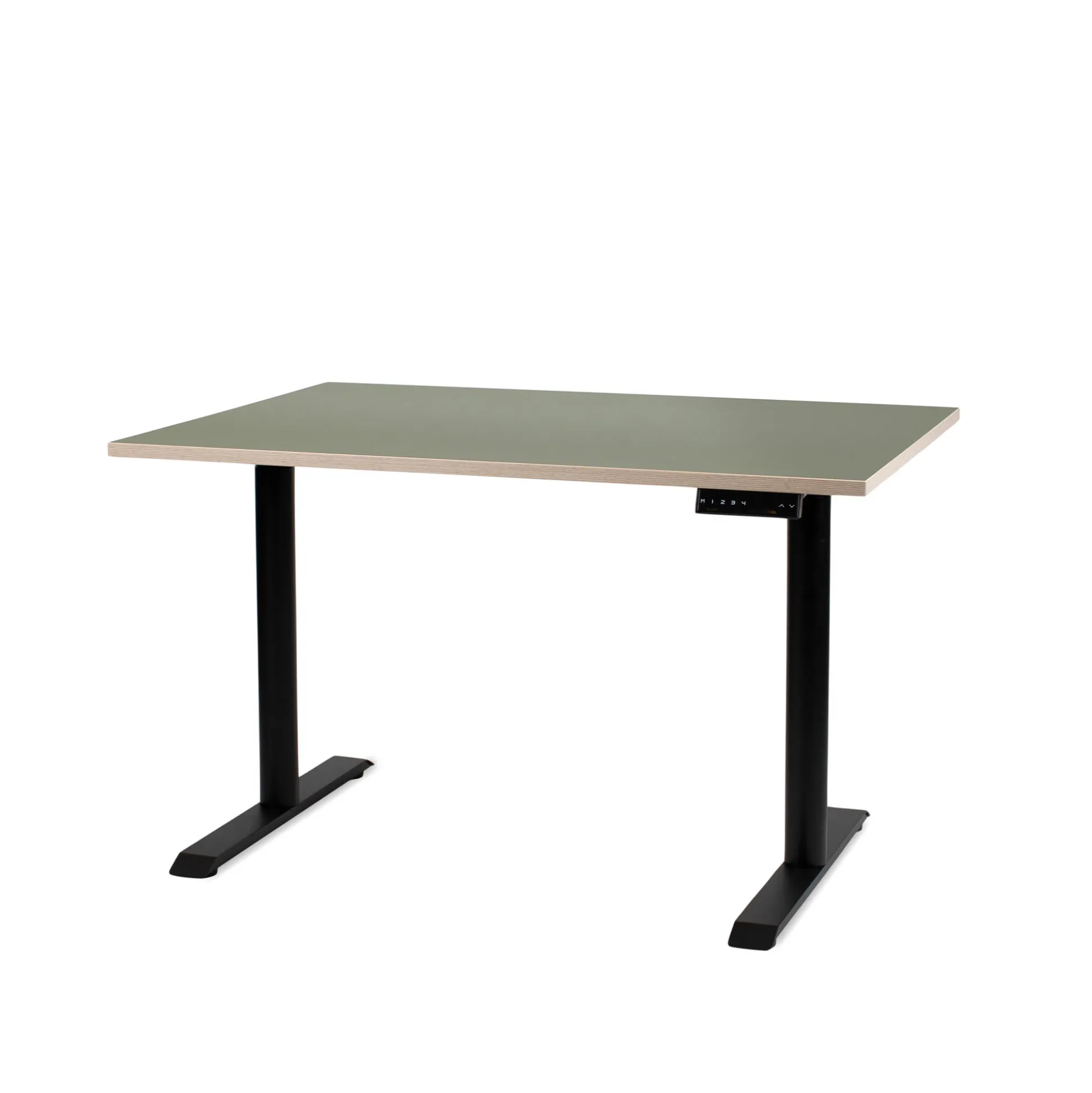 Det viste Manager Pro hæve sænkebord er med et sort stålstel og en lækker Olive (4184) bordplade i linoleum, som måler 80×120 cm. Bordpladen er med rette krydsfiner kanter, som gør bordpladen mere modstandsdygtig overfor slag.