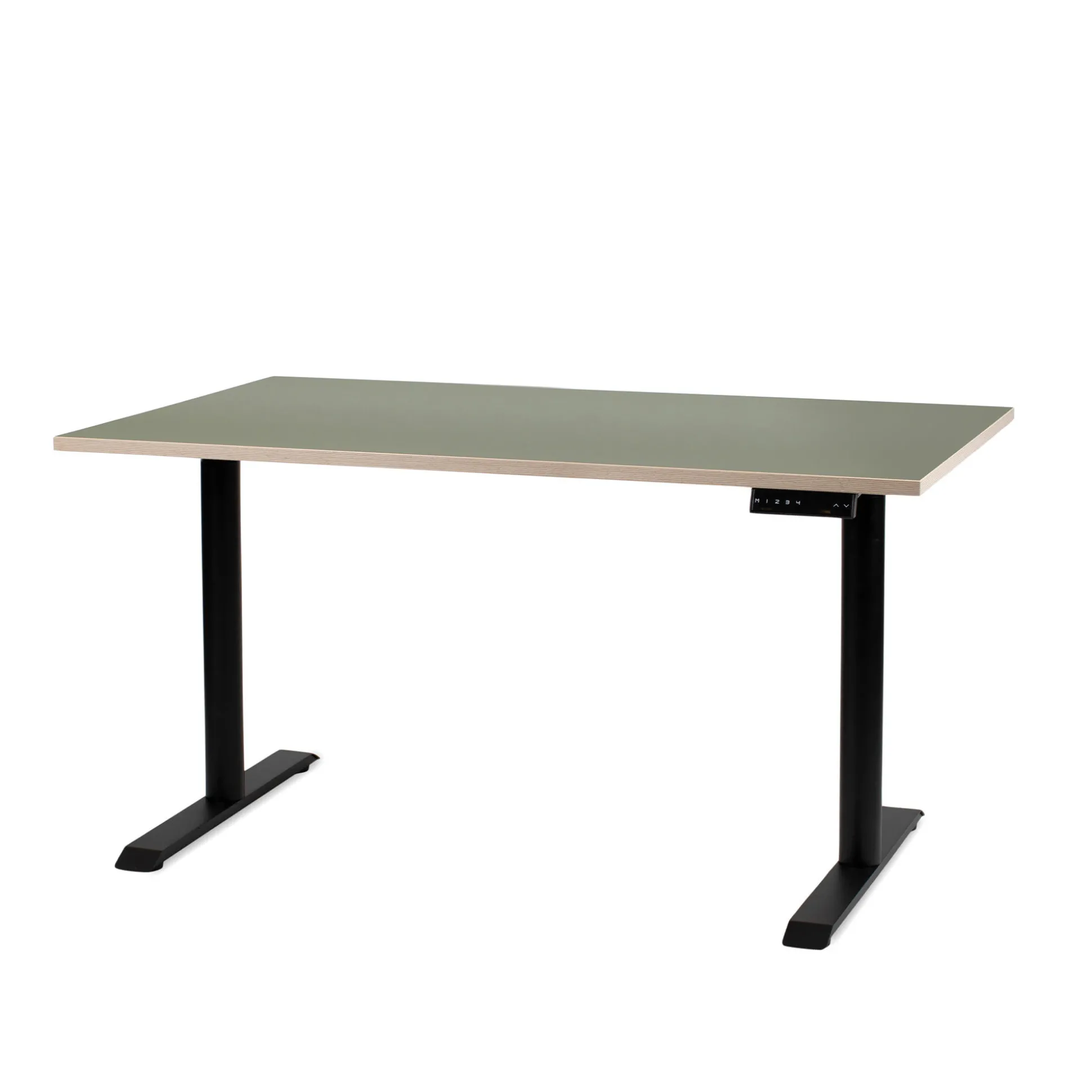 Det viste Manager Pro hæve sænkebord er med et sort stålstel og en lækker Olive (4184) bordplade i linoleum, som måler 80×160 cm. Bordpladen er med rette krydsfiner kanter, som gør bordpladen mere modstandsdygtig overfor slag.
