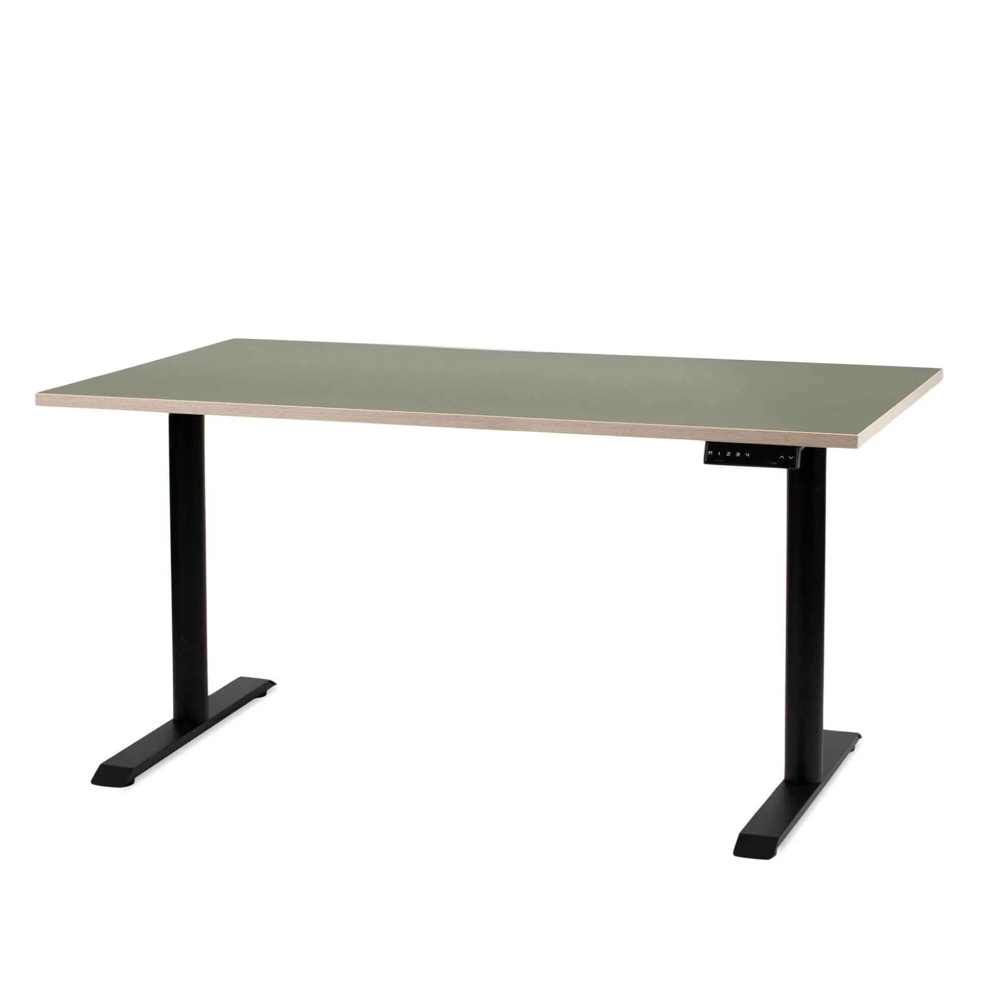 Det viste Manager Pro hæve sænkebord er med et sort stålstel og en lækker Olive (4184) bordplade i linoleum, som måler 90×180 cm. Bordpladen er med rette krydsfiner kanter, som gør bordpladen mere modstandsdygtig overfor slag.