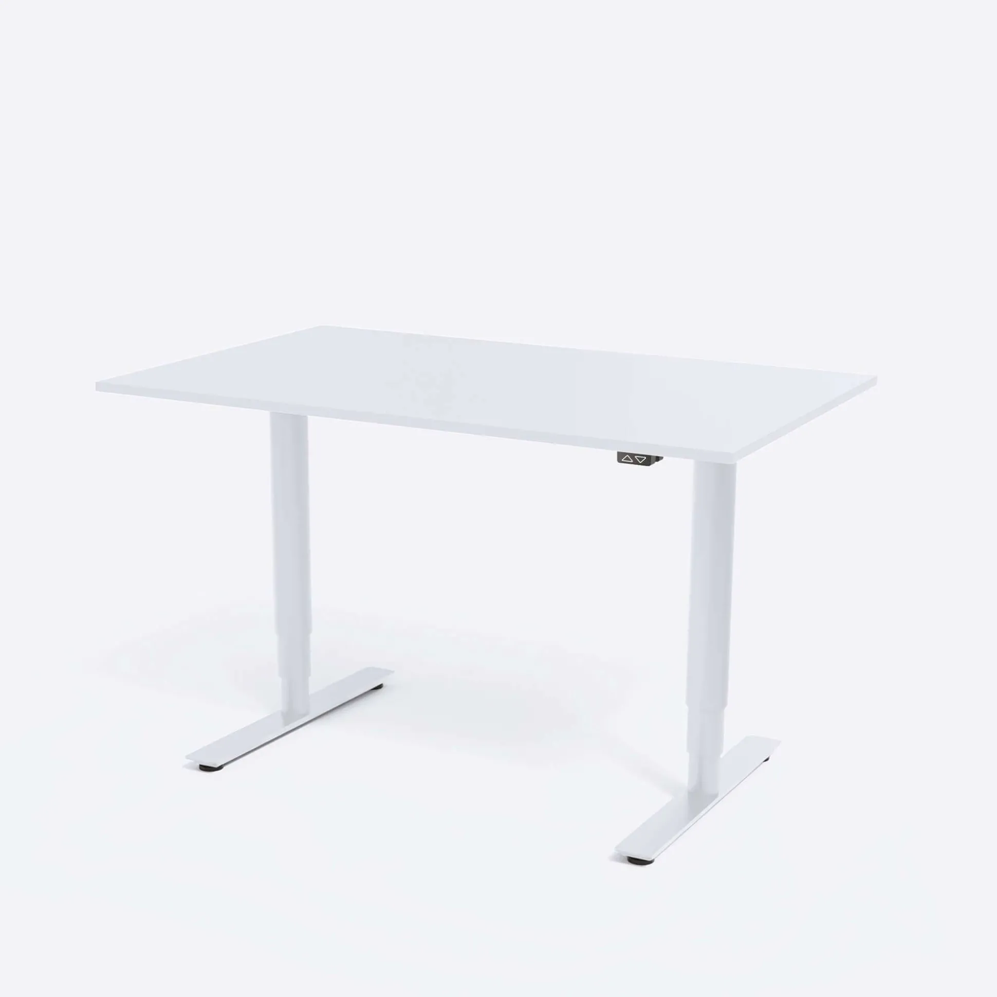 Det viste EP5500 hæve sænkebord har et hvidt stål stel med runde slanke søjler og en slidstærk hvid bordplade i decor laminat, som måler 80×120 cm.