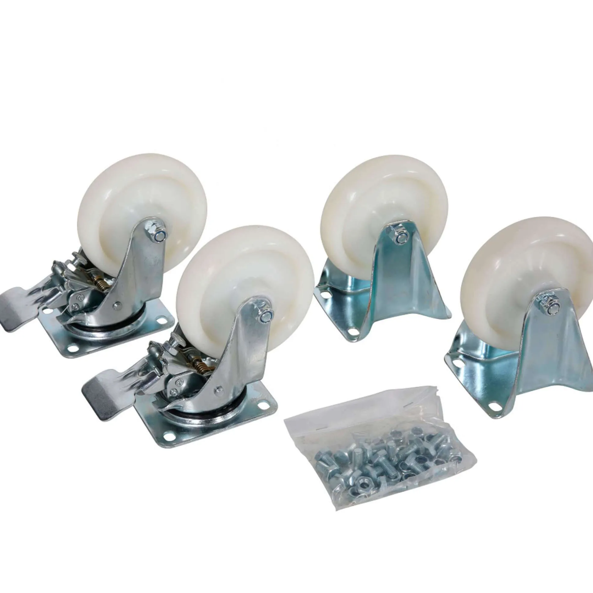 1 sæt inkluderer: 2 faste hjul, 2 roterende hjul med bremse, 16 skruer og møtrikker.