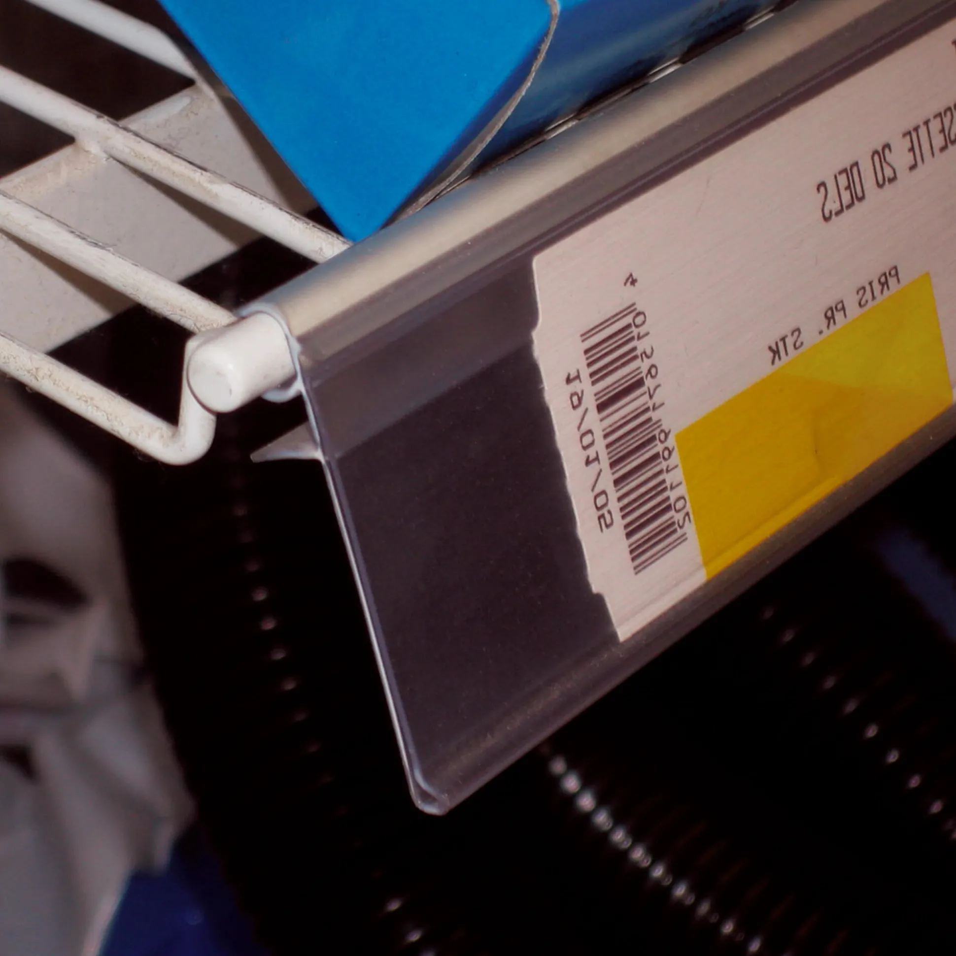 Hyldeforkanten er udført i klar plast, og passer til trådhylder. Fås i transparent eller med rød, sort eller lysgrå bagside. Den er skrå, hvilket gør det nemmere at se prisen. Mindstekøb 50 stk. (f.eks. 50 – 100…)
