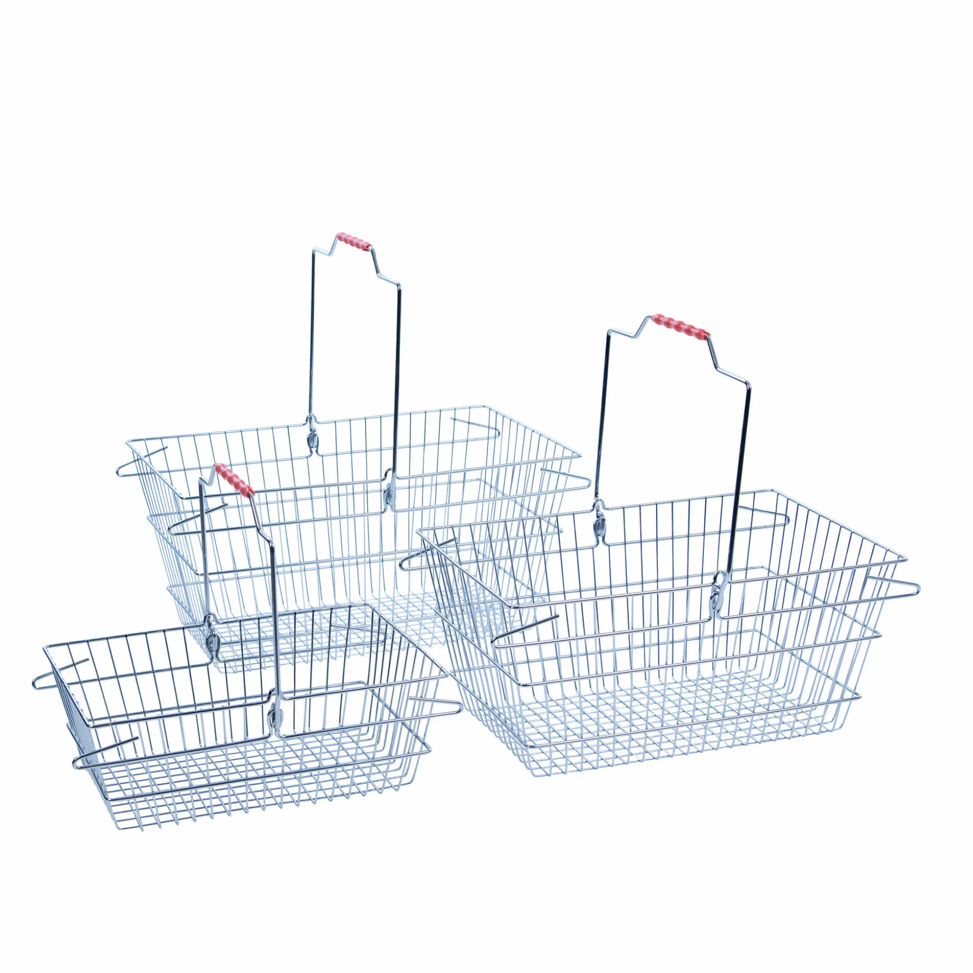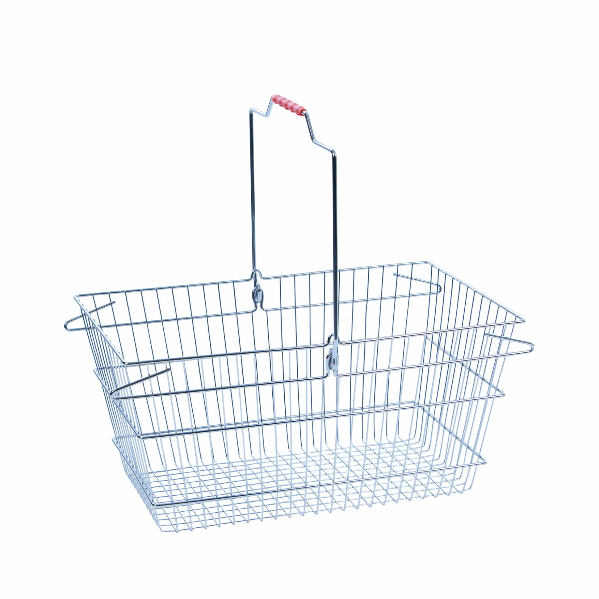 Indkøbskurv i forkromet tråd. Kurv er forsynet med komfortable plastgreb i rødt.