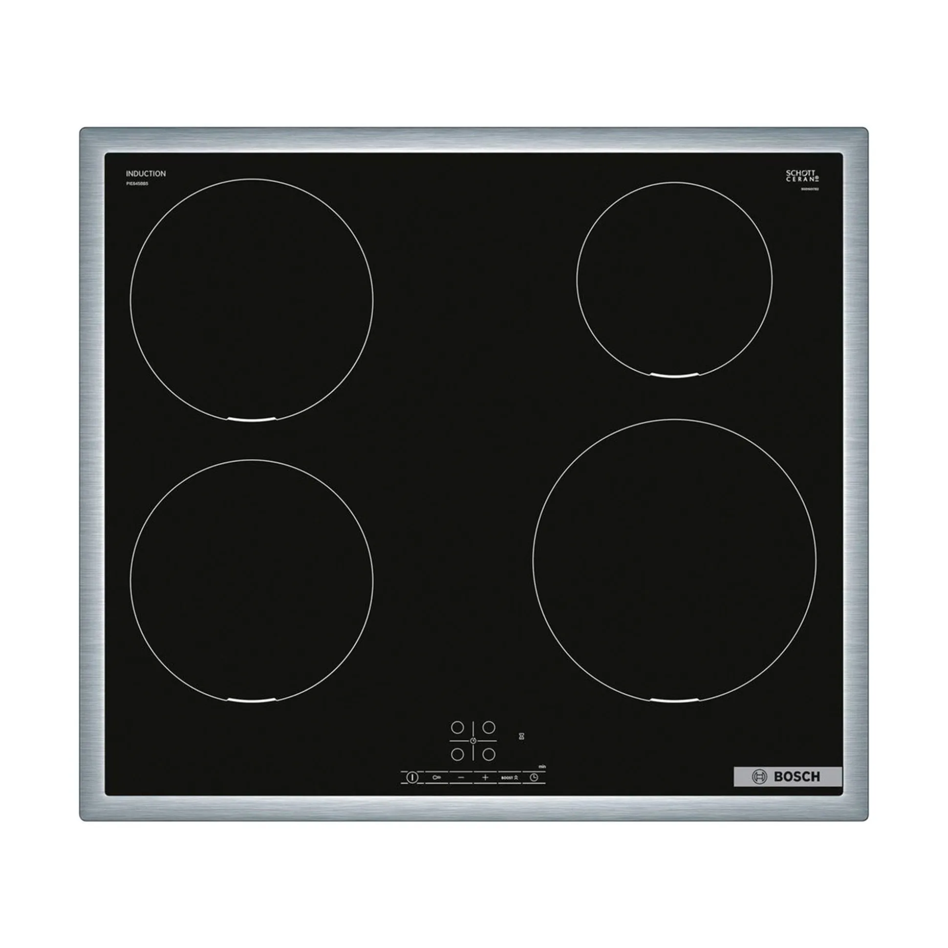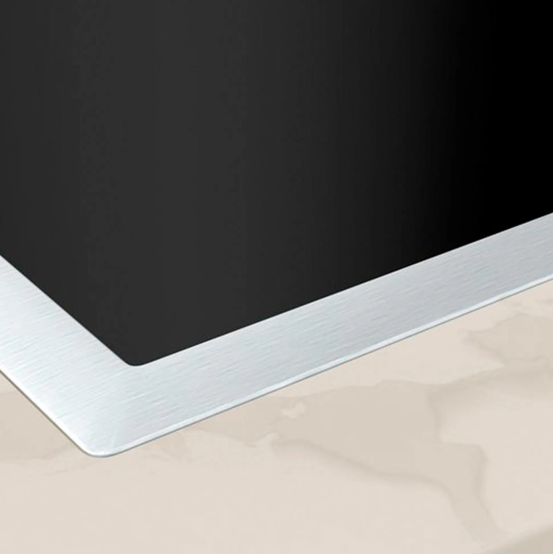 Bosch PIE645BB5E er en sort induktionskogeplade med en stilfuld ramme i rustfrit stål. Den er designet til effektiv og sikker madlavning med et lavt energiforbrug.