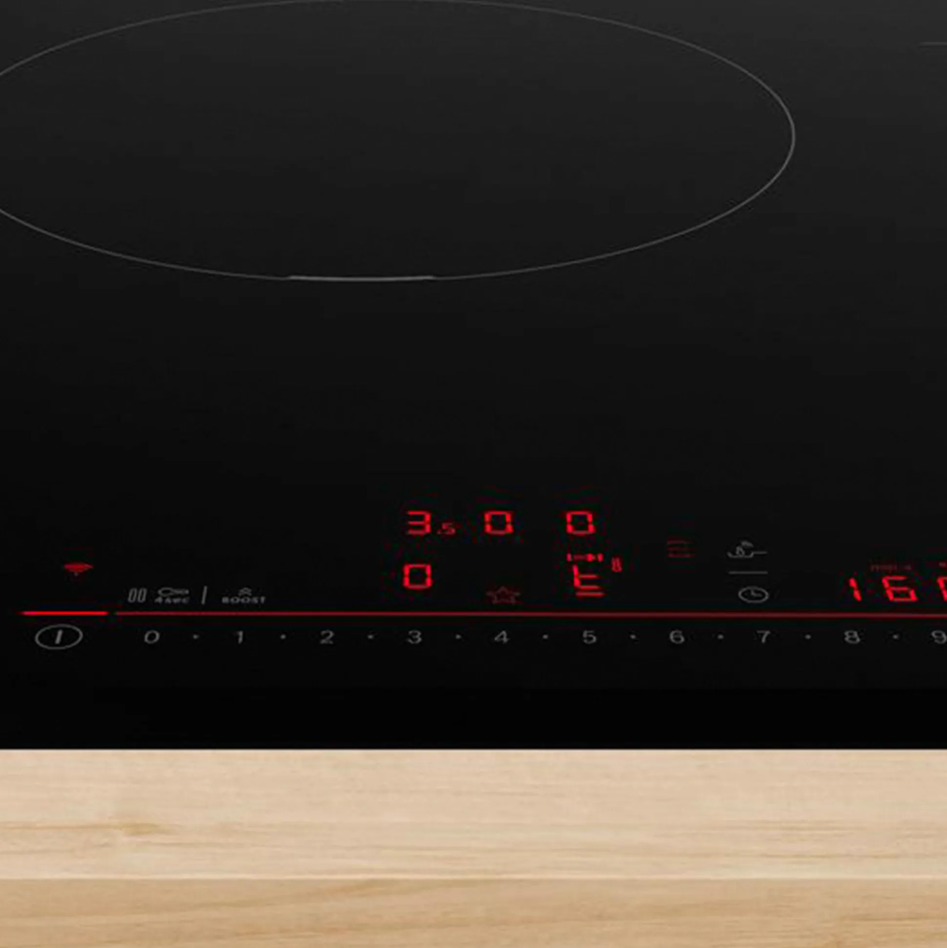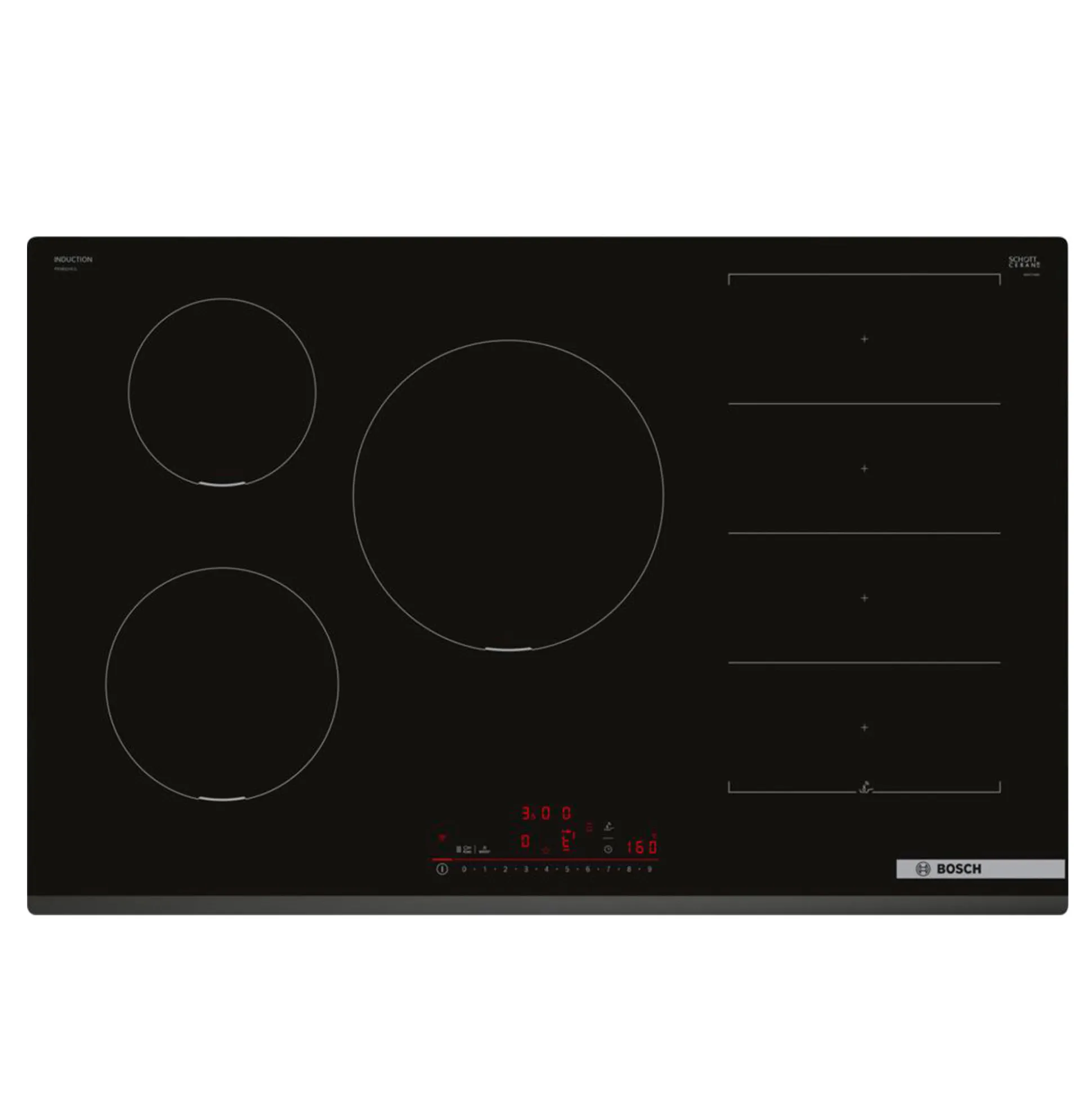 Bosch PXV831HC1E er en stilfuld sort induktionskogeplade på 80 cm, der kombinerer moderne design med avanceret funktionalitet. Den er designet til overflademontering uden ramme, hvilket giver et elegant og strømlinet udseende.