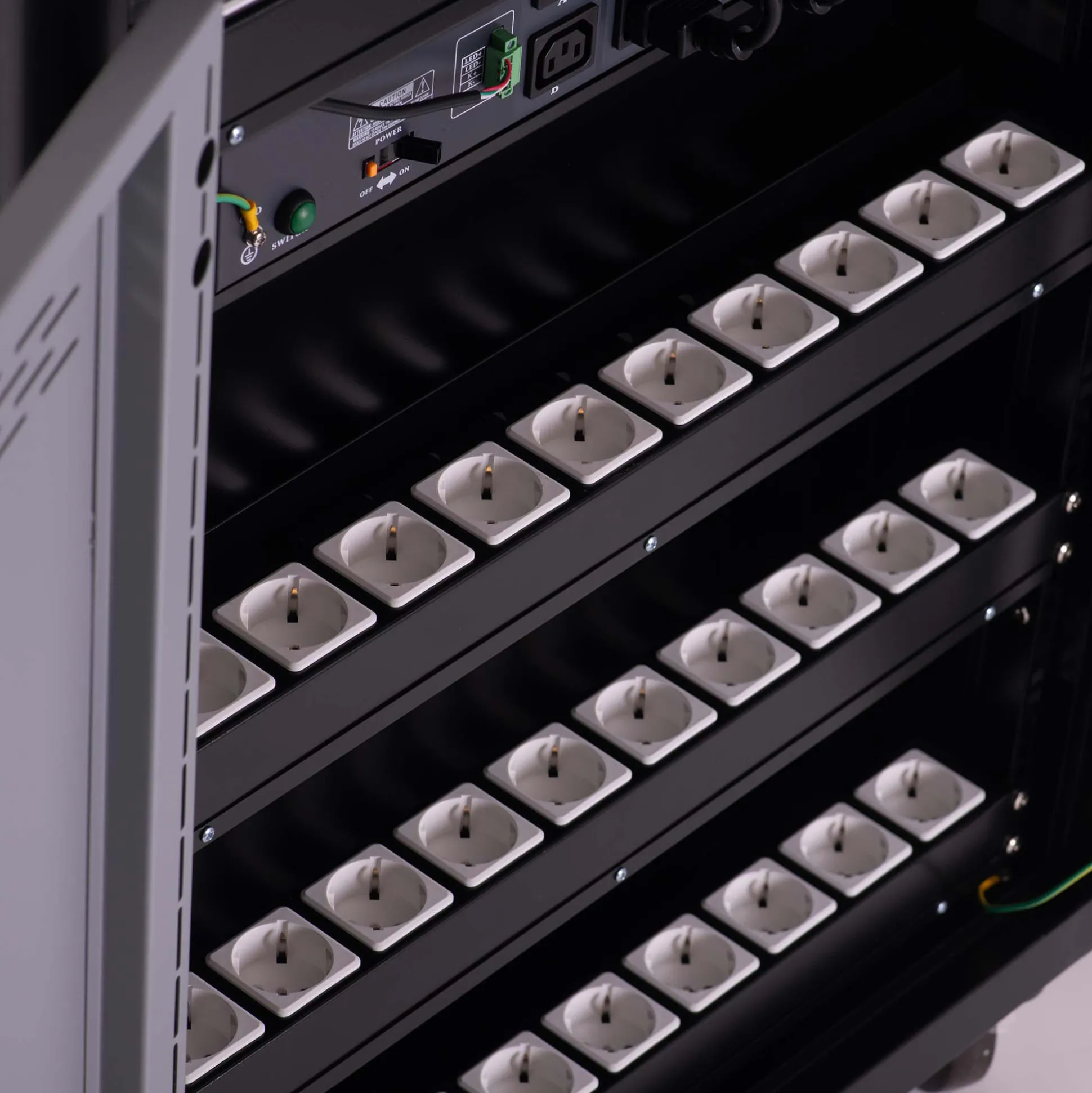 Skabene opstartes i 4 intervaller, for mindre pres på el-installationen. Og har overspændingssikring, for beskyttelse af de de opbevarede enheder.