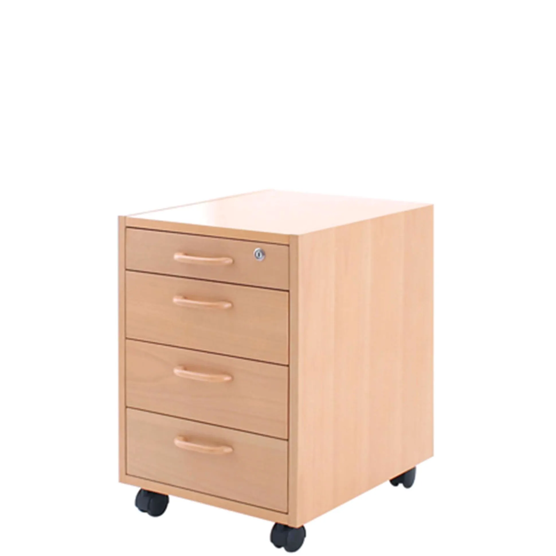 Triform skuffekassettte i træfinér med 4 skuffer. Kassettten er med 4 hjul og lås. Leveres samlede (Kun hjul og greb skal eftermonteres). Måler 50x40x58h cm.