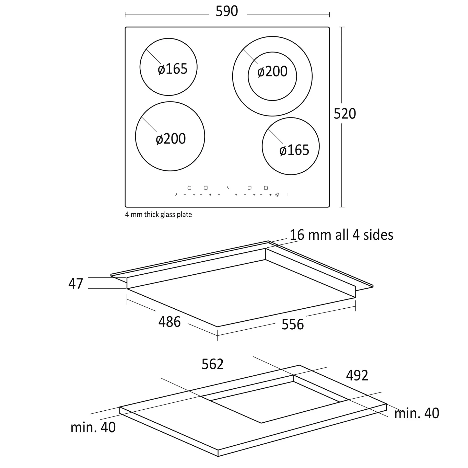 - Glasplade mål, HxBxD, mm: 4 x 590 x 520