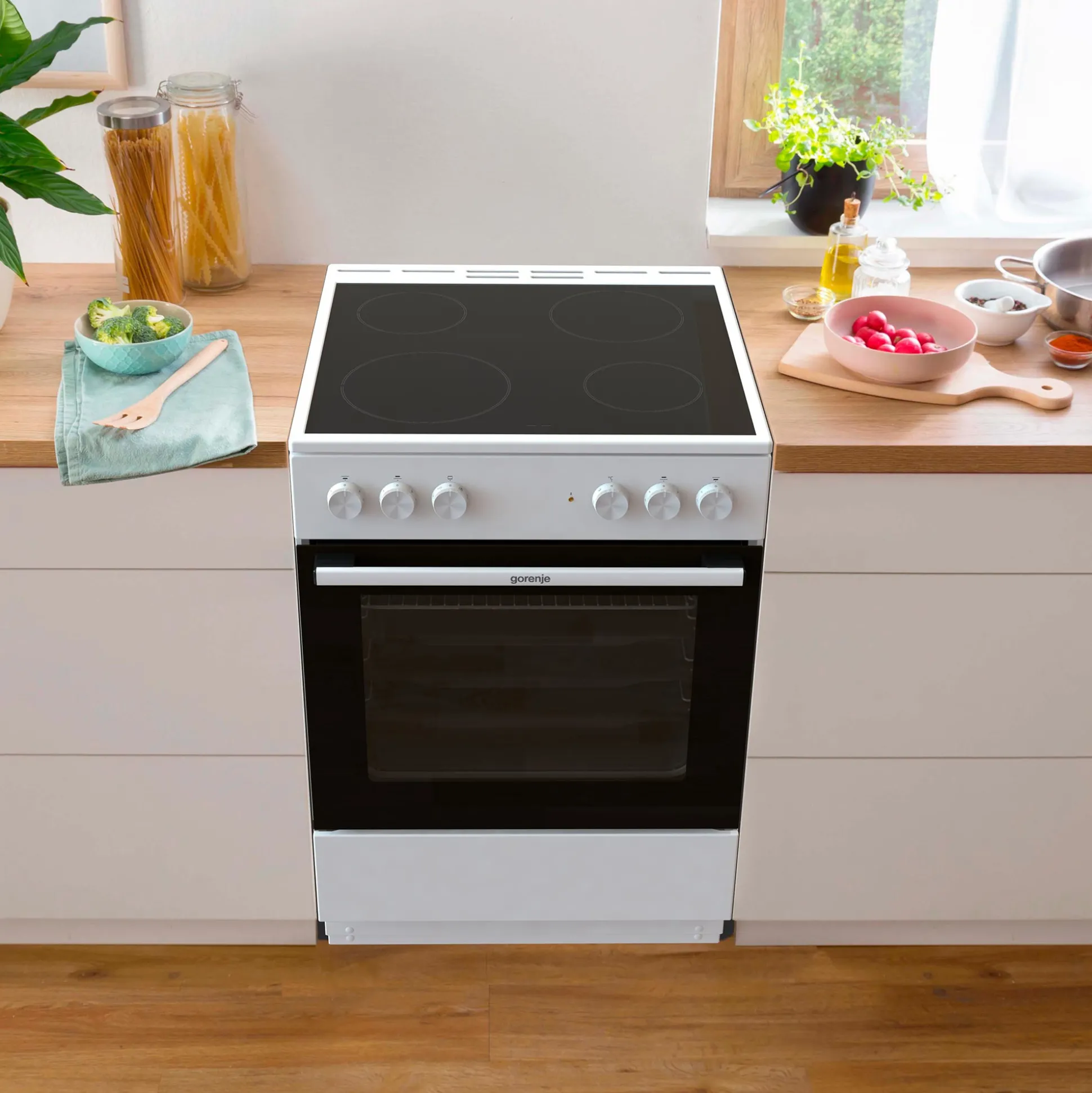 Med ergonomiske knapper er betjeningen af komfuret både nem og komfortabel. Komfuret er udstyret med en kompakt ovnlåge med to lag glas, som holder døren kølig under brug. Den mekaniske børnesikring og indikatoren for restvarme gør det ekstra sikkert at bruge, især i husholdninger med børn.