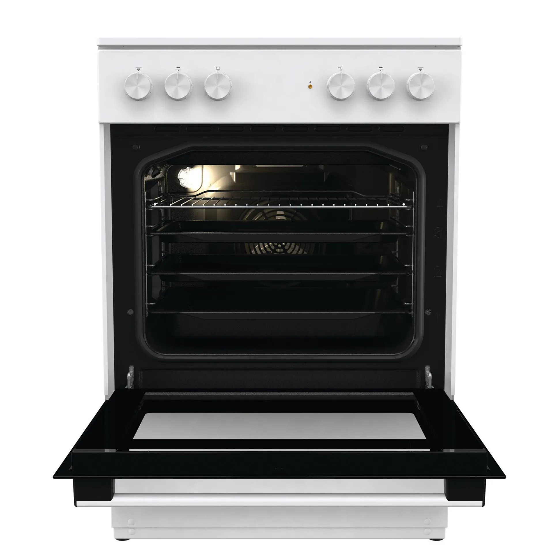 Komfuret er udstyret med en kompakt ovnlåge med to lag glas, som sikrer, at døren forbliver kølig under brug. Det mekaniske børnesikringssystem og en restvarmeindikator giver ekstra tryghed i køkkenet, især når der er børn til stede.