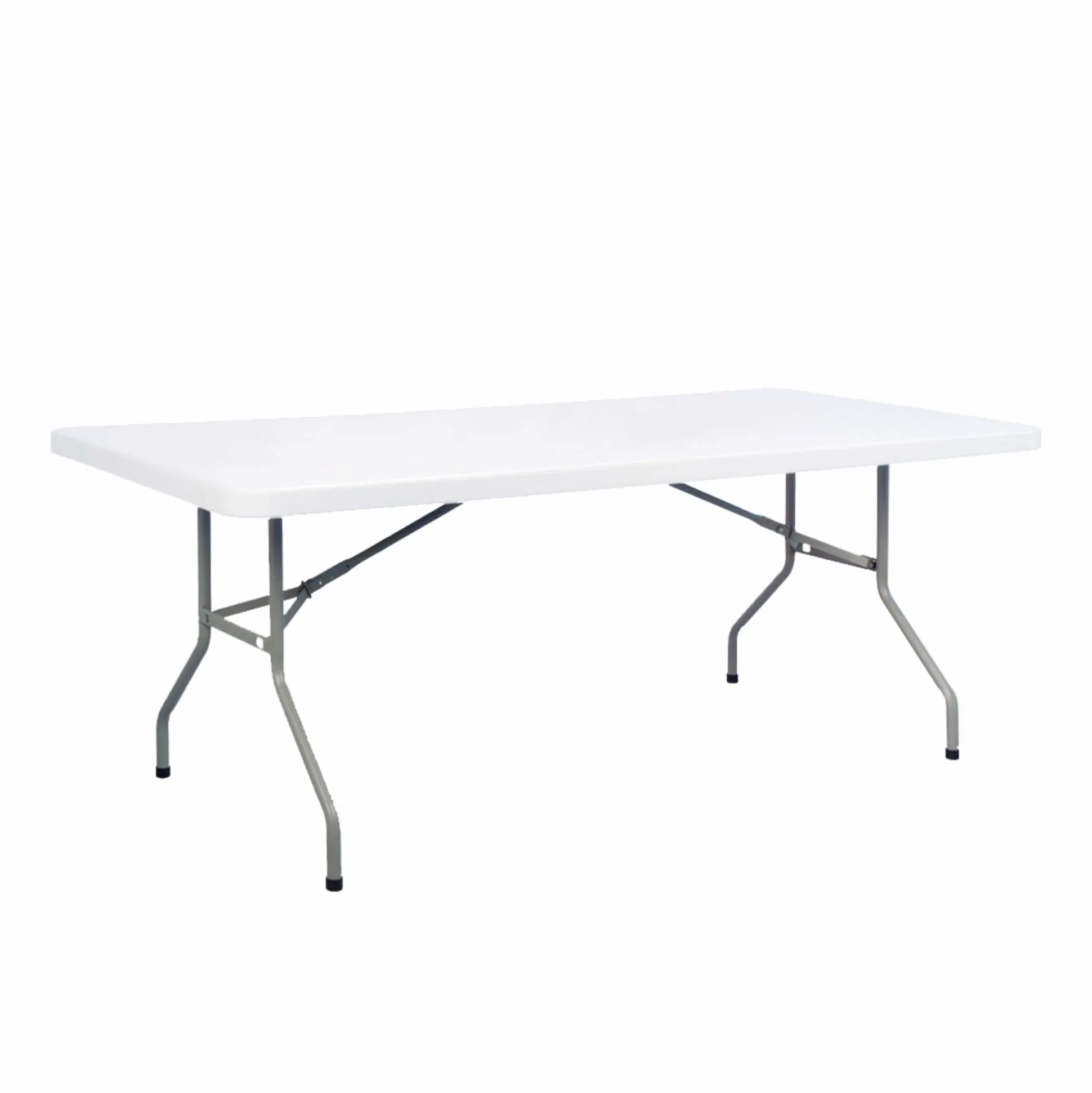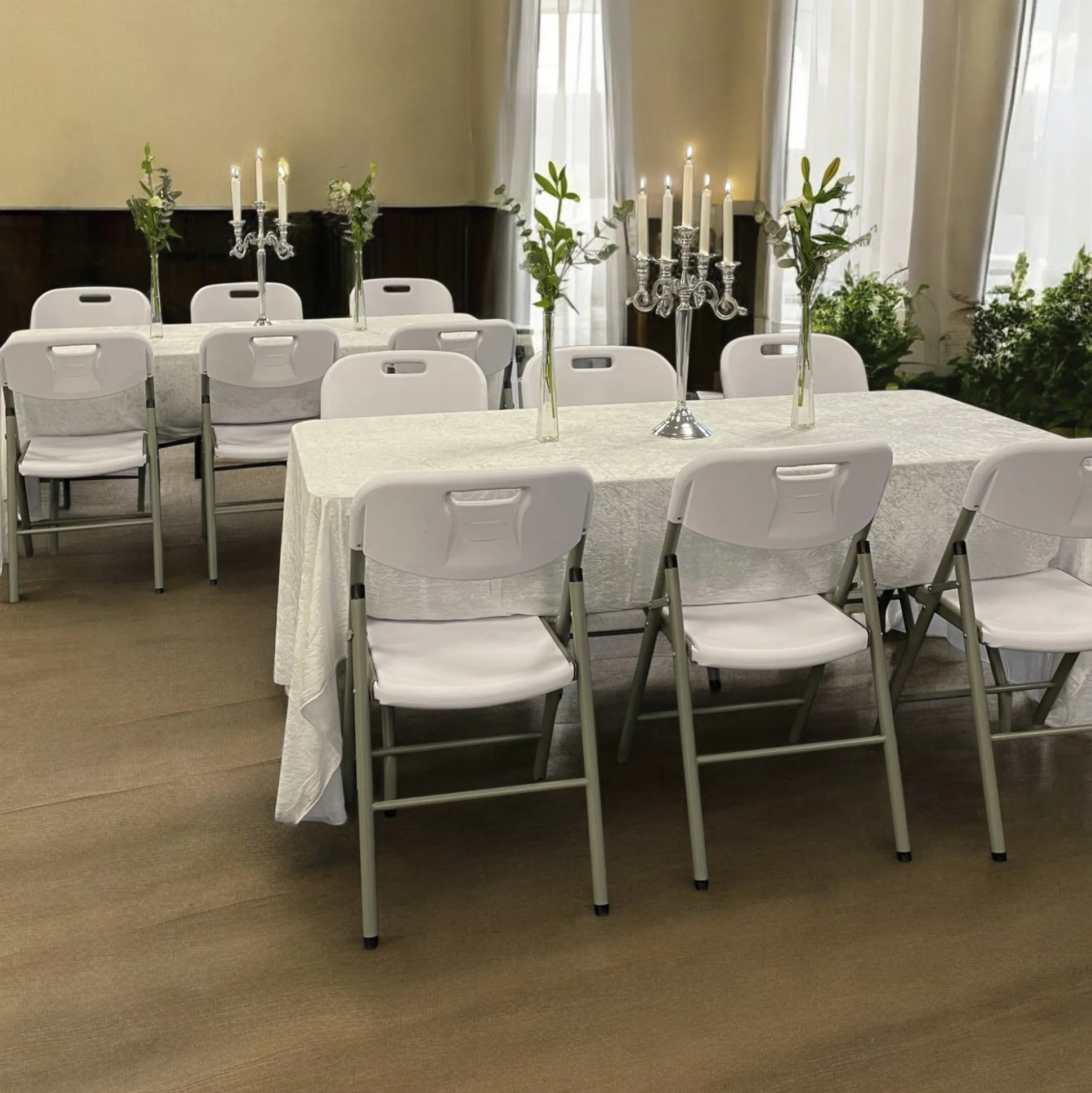 American klapbord 76 x 183 cm. lavet med letvægts stålstel og en helstøbt bordplade i hvid plast. Hertil 6 stk. American klapstole med samme letvægts stålstel, hvidt plastsæde og ryg. Robust og yderst velegnet til forsamlinger både ude og inde. Stolene har en max belastning op til 200 kg. Bordet klarer en vægt på op til 400 kg. jævnt fordelt. Klapbordene kan let klappes sammen og stables oven på hinanden. Ønskes en bordvogn til klapbordene, se “Andre købte også”