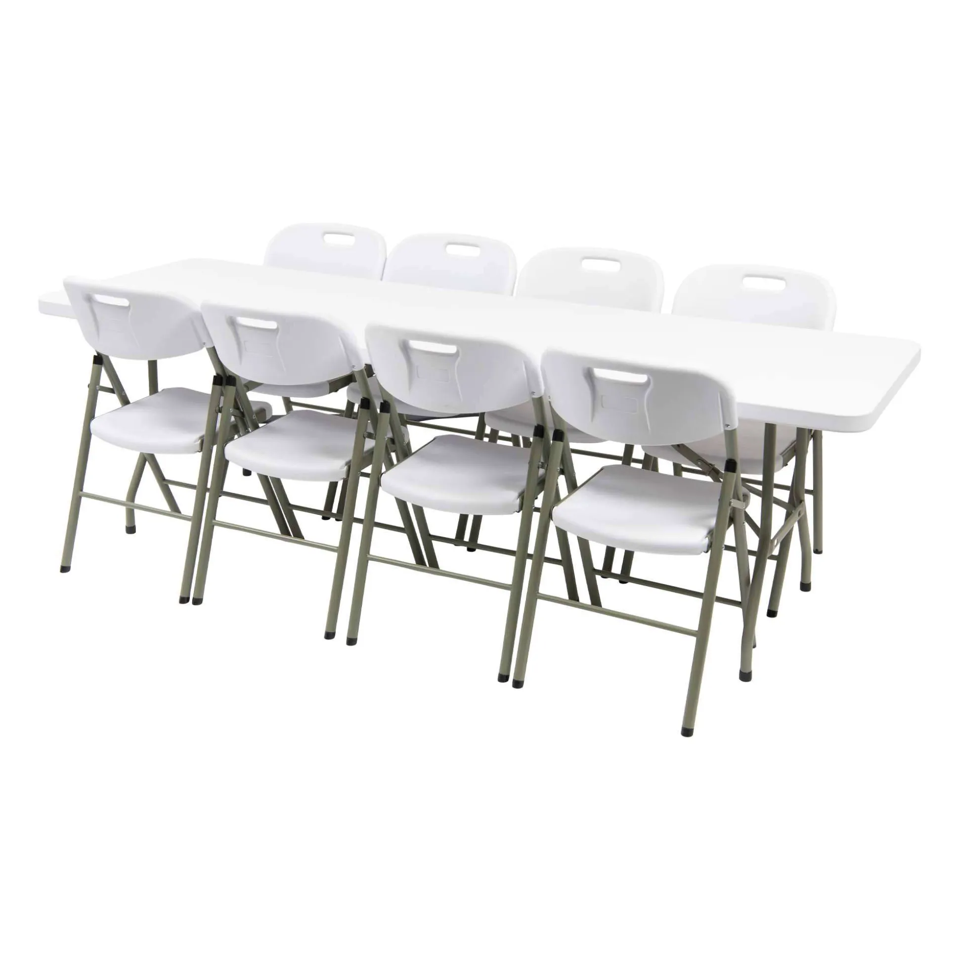 American klapbord 76 x 244 cm. lavet med letvægts stålstel og en helstøbt bordplade i hvid plast. Hertil 8 stk. American klapstole med samme letvægts stålstel, hvidt plastsæde og ryg. Robust og yderst velegnet til forsamlinger både ude og inde. Stolene har en max belastning op til 200 kg. Bordet klarer en vægt på op til 400 kg. jævnt fordelt. Klapbordene kan let klappes sammen og stables oven på hinanden. Ønskes en bordvogn til klapbordene, se “Andre købte også”