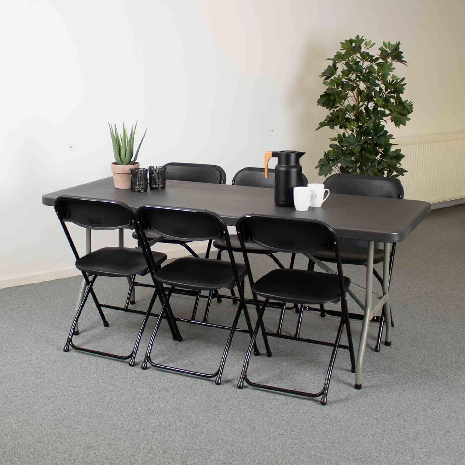 American klapbord 76x183x74,5h cm med 6 Samson Lux klapstole. Klapbordet har et letvægts stålstel og en helstøbt bordplade i Antracit plast. På trods af bordets lette design, er det super robust og kan det holde til 400 kg jævnt fordelt.