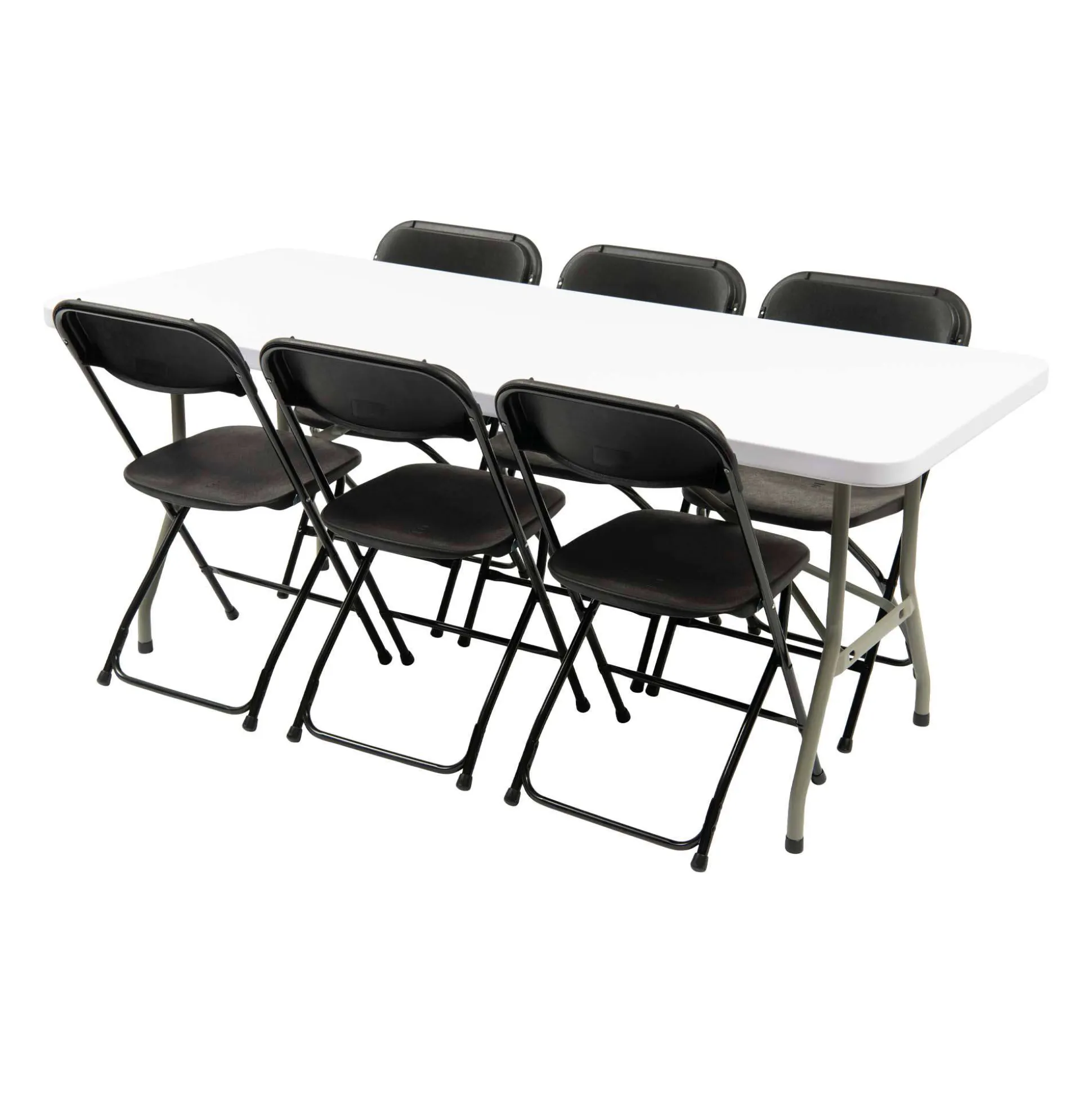 American klapbord 76x183x74,5h cm med 6 Samson klapstole. Klapbordet har et letvægts stålstel og en helstøbt bordplade i hvid plast. På trods af bordets lette design, er det super robust og kan det holde til 400 kg jævnt fordelt. Samson klapstolen har både sæde og ryg i solidt, formstøbt plast og et stel i lakerede stålrør. Stolen er let men kan holde til 150 kg.