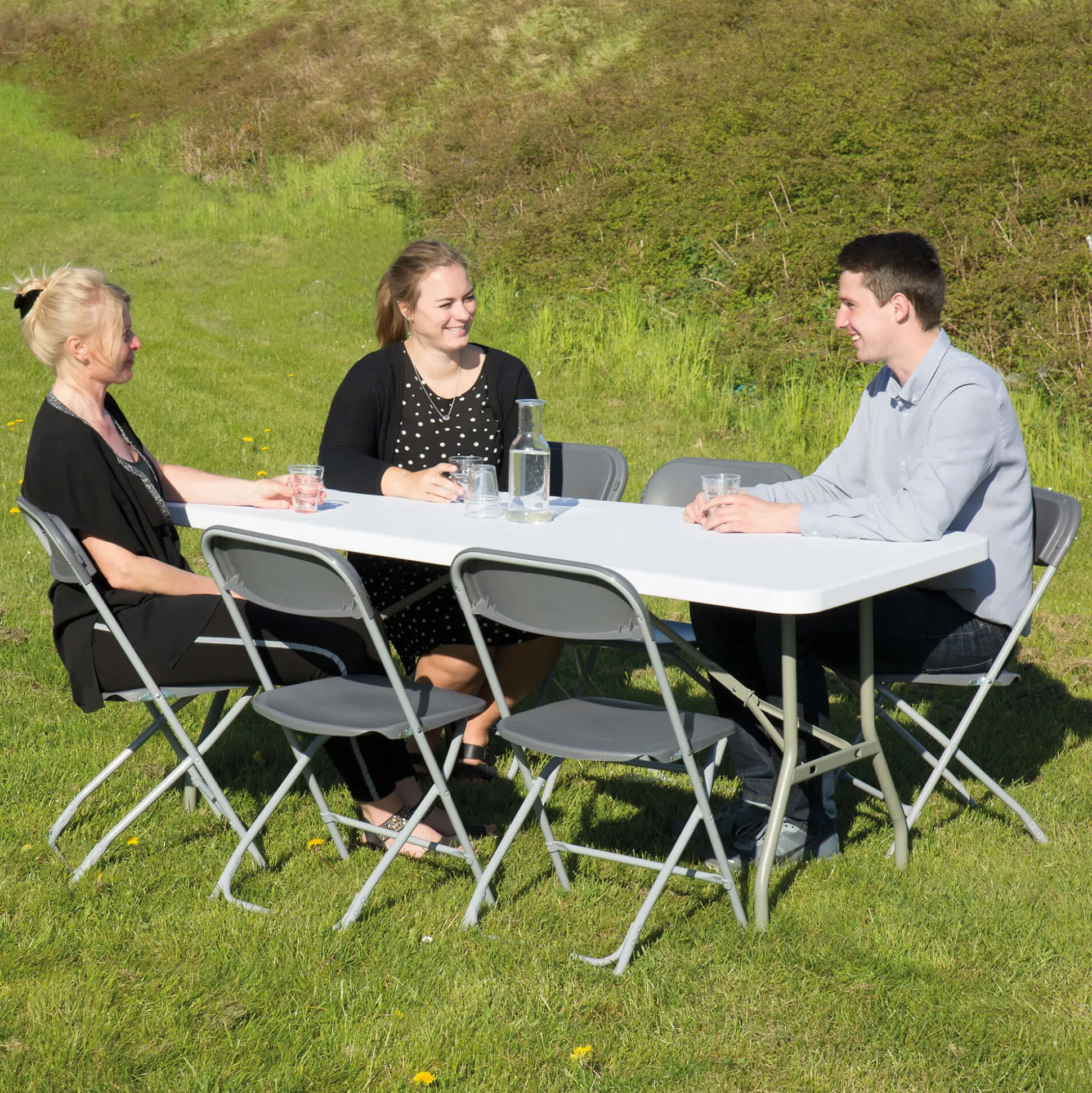 Sættet er perfekt til både uden- og indendørsfester. Både bord og stole kan let klappes sammen og opbevares på et minimum af plads.