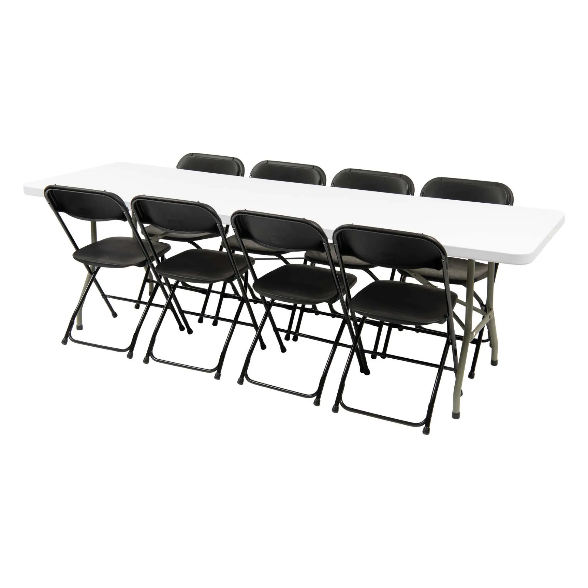 American klapbord 76x244x74,5h cm med 6 Samson klapstole. Klapbordet har et letvægts stålstel og en helstøbt bordplade i hvid plast. På trods af bordets lette design, er det super robust og kan det holde til 400 kg jævnt fordelt. Samson klapstolen har både sæde og ryg i solidt, formstøbt plast og et stel i lakerede stålrør. Stolen er let men kan holde til 150 kg.