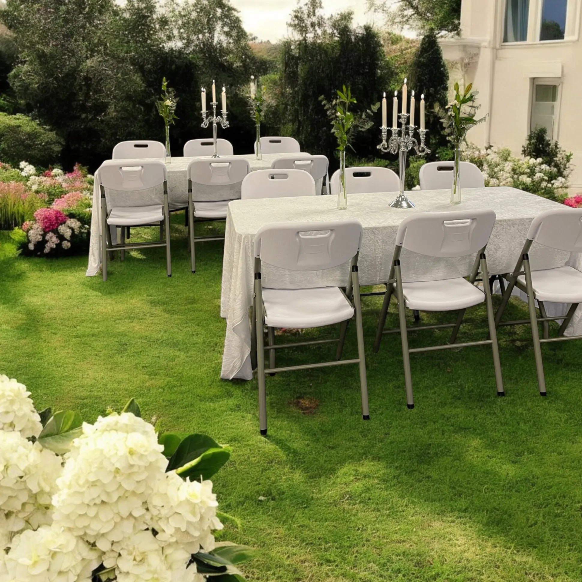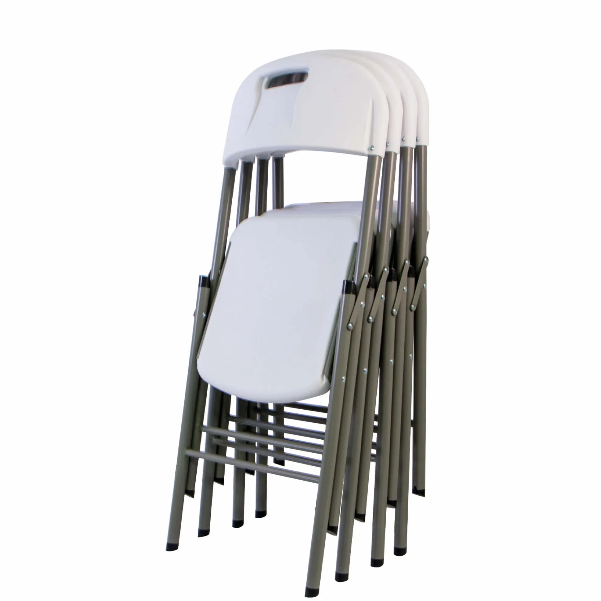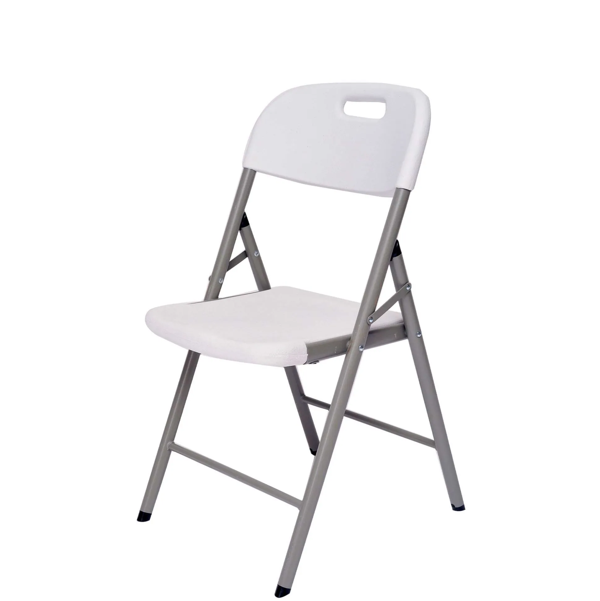 American klapstol i solidt letvægts stålstel i grå, med sæde og ryg i hvid plast. Stolen har en maks. belastning op til 200 kg. Klappes let sammen så stolen fylder mindst muligt. Klapstolen er 48 cm bred og har en siddehøjde på 45 cm. God til fester både ude- og indendørs.