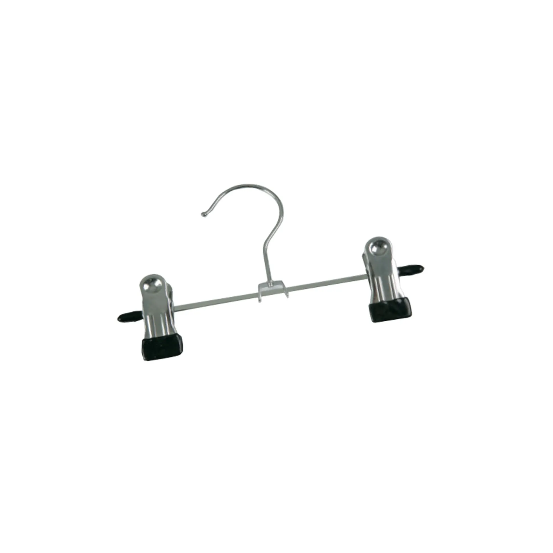 Klemmebøjle i blank metal. 20 cm. med clips for præsentation af bla. bukser, nederdel eller toppe. Der er fast krog på bøjlen og sort plast som beskytter tøjet mod trykmærker.