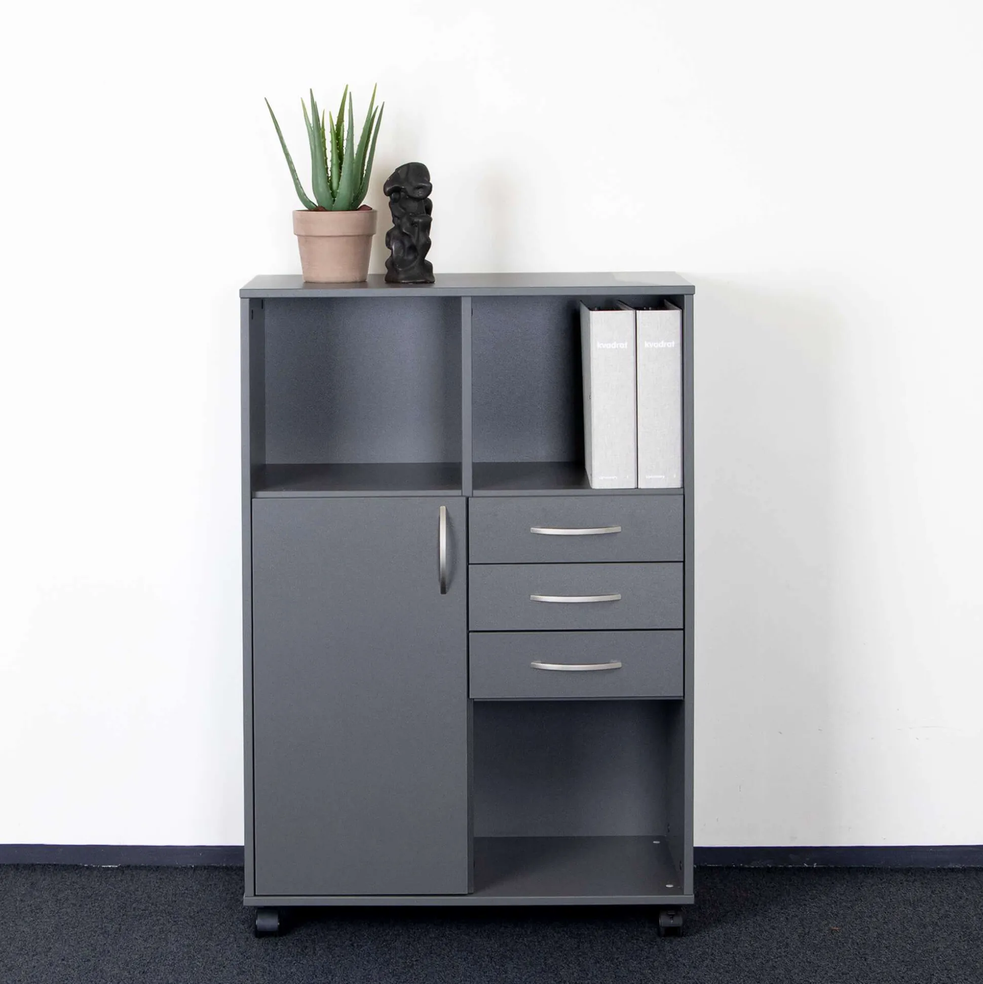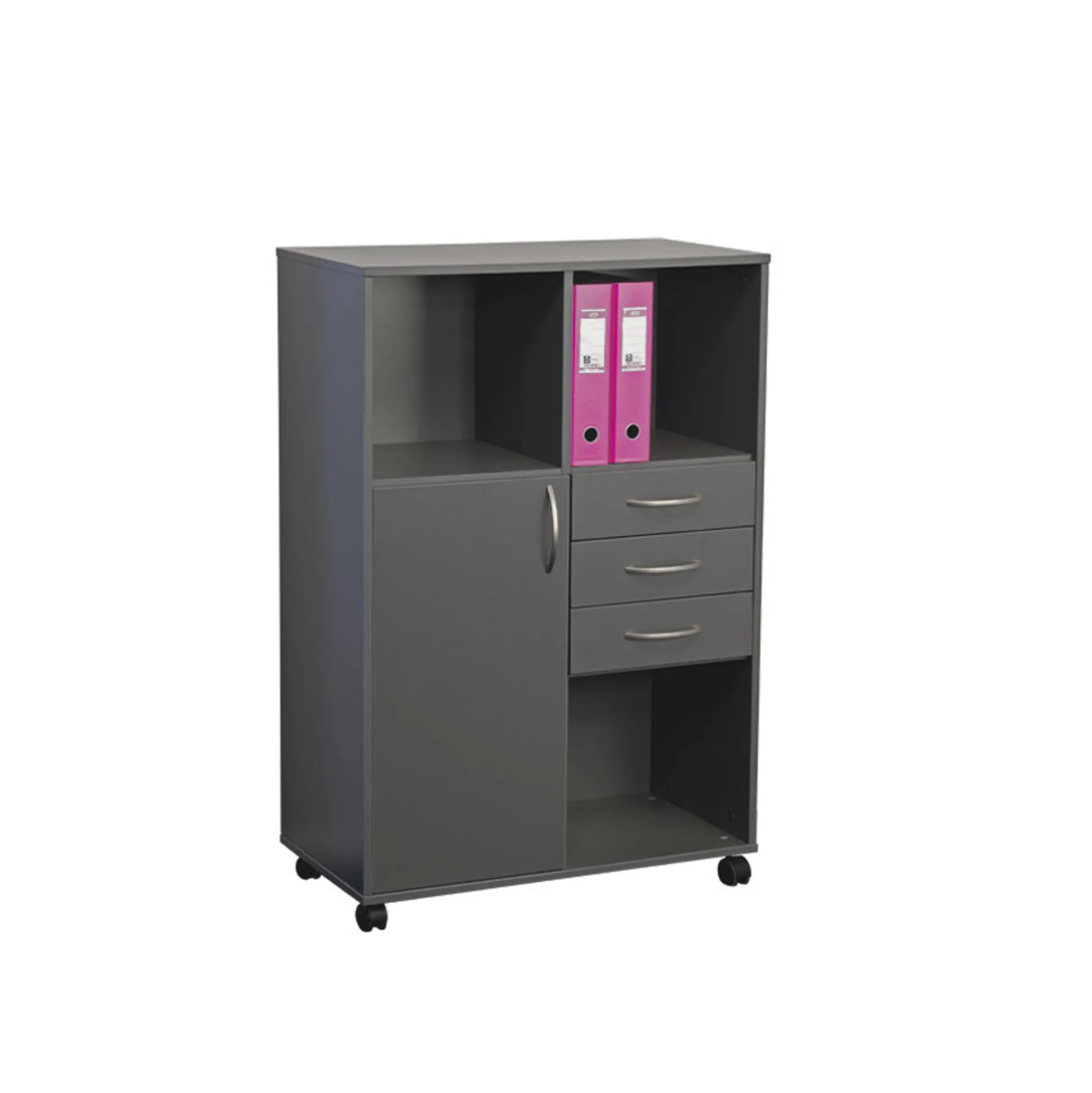 EPF kontorreol med 2x3h rum, samt 1 låge og 3 skuffer. Reolen er i slidstærk decor laminat og med hjul. Reolen leveres samlet og måler 38x78x116h cm. Solid reol med gode opbevarings muligheder. Passer perfekt til ringbind. Reolen lagerføres i mørkegrå, men kan bestilles i følgende farver hvid, sort, eg eller bøg med en leveringstid på ca. 4 uger. Skriv under “Bemærkning” hvis du ønsker en anden farve end antracit. Reolen leveres samlet, du skal blot montere hjul. Reolen fås også uden låge og skuffer, se under “Andre købte også”.
