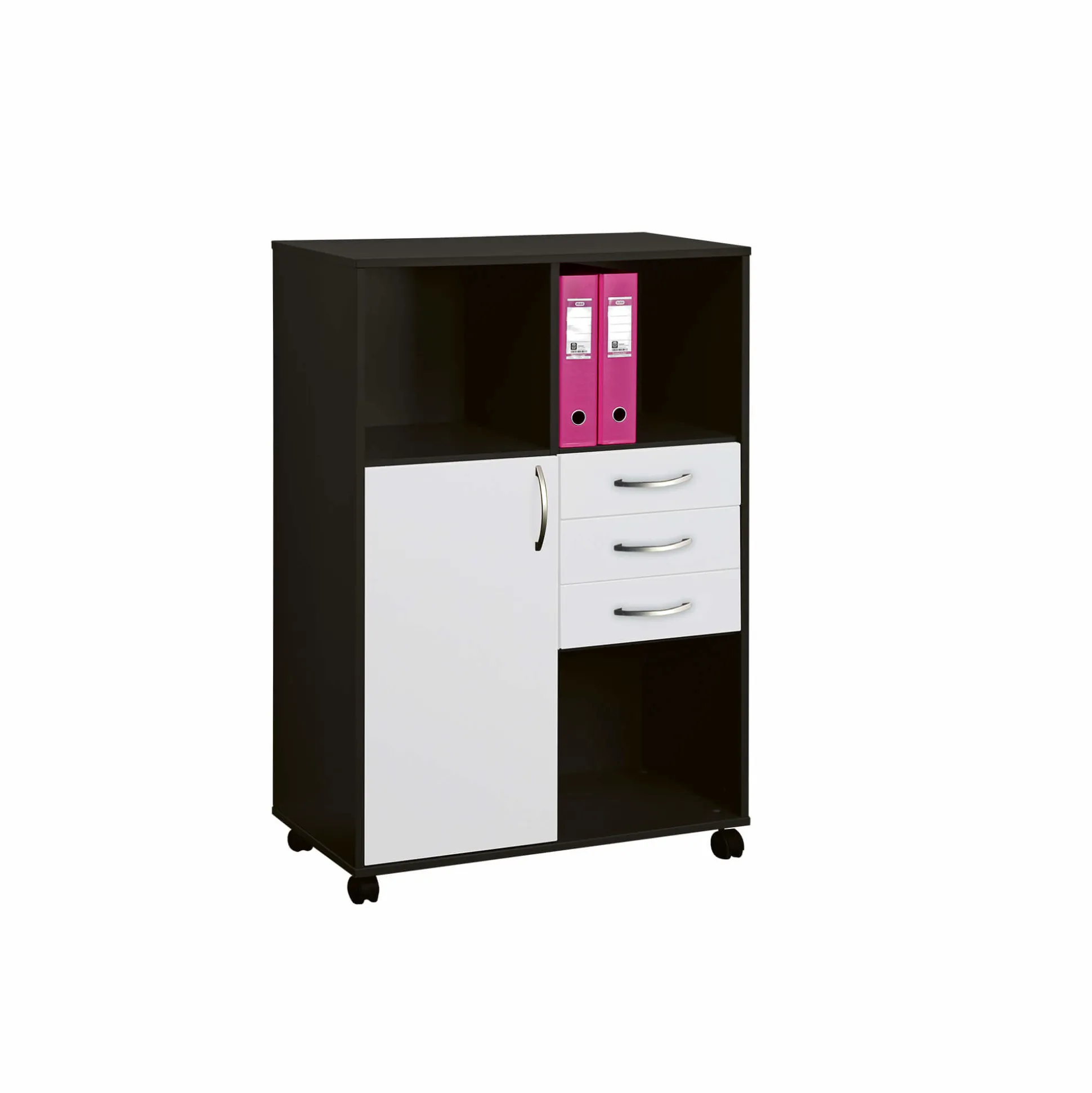 EPF kontorreol med 2x3h rum, samt 1 låge og 3 skuffer. Reolen er i slidstærk decor laminat og med hjul. Reolen leveres samlet og måler 38x78x116h cm. Solid reol med gode opbevarings muligheder. Passer perfekt til ringbind. Reolen har sort korpus og hvide fronter. Reolen leveres samlet, du skal blot montere hjul.
