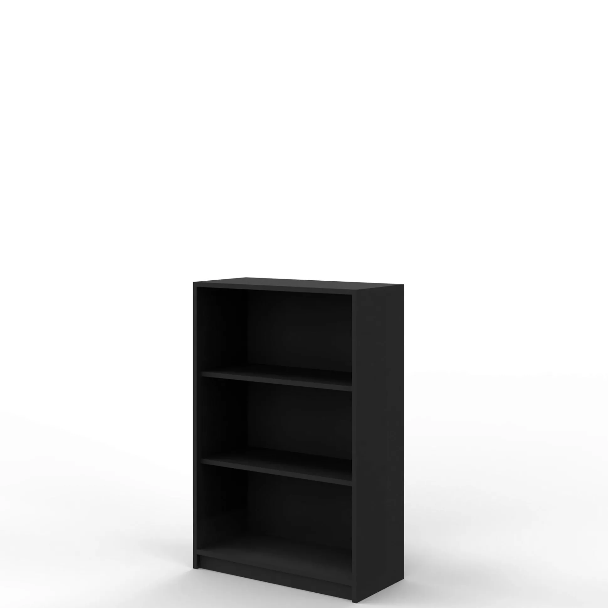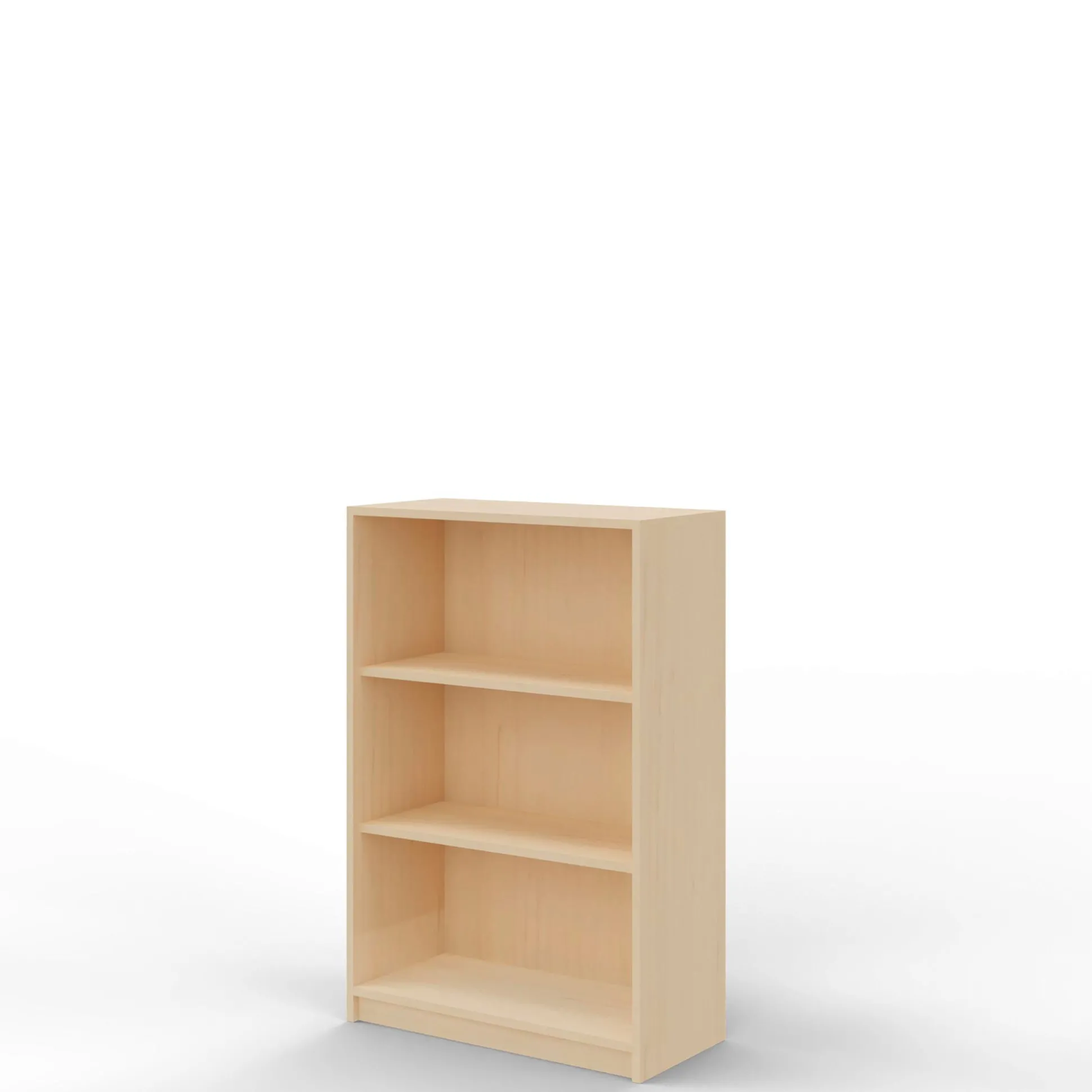 Den viste reol fås i flere farver og er lavet i enten slidstæk decor laminat eller naturligt træfinér. Den er 3 rum høj og med integreret sokkel.