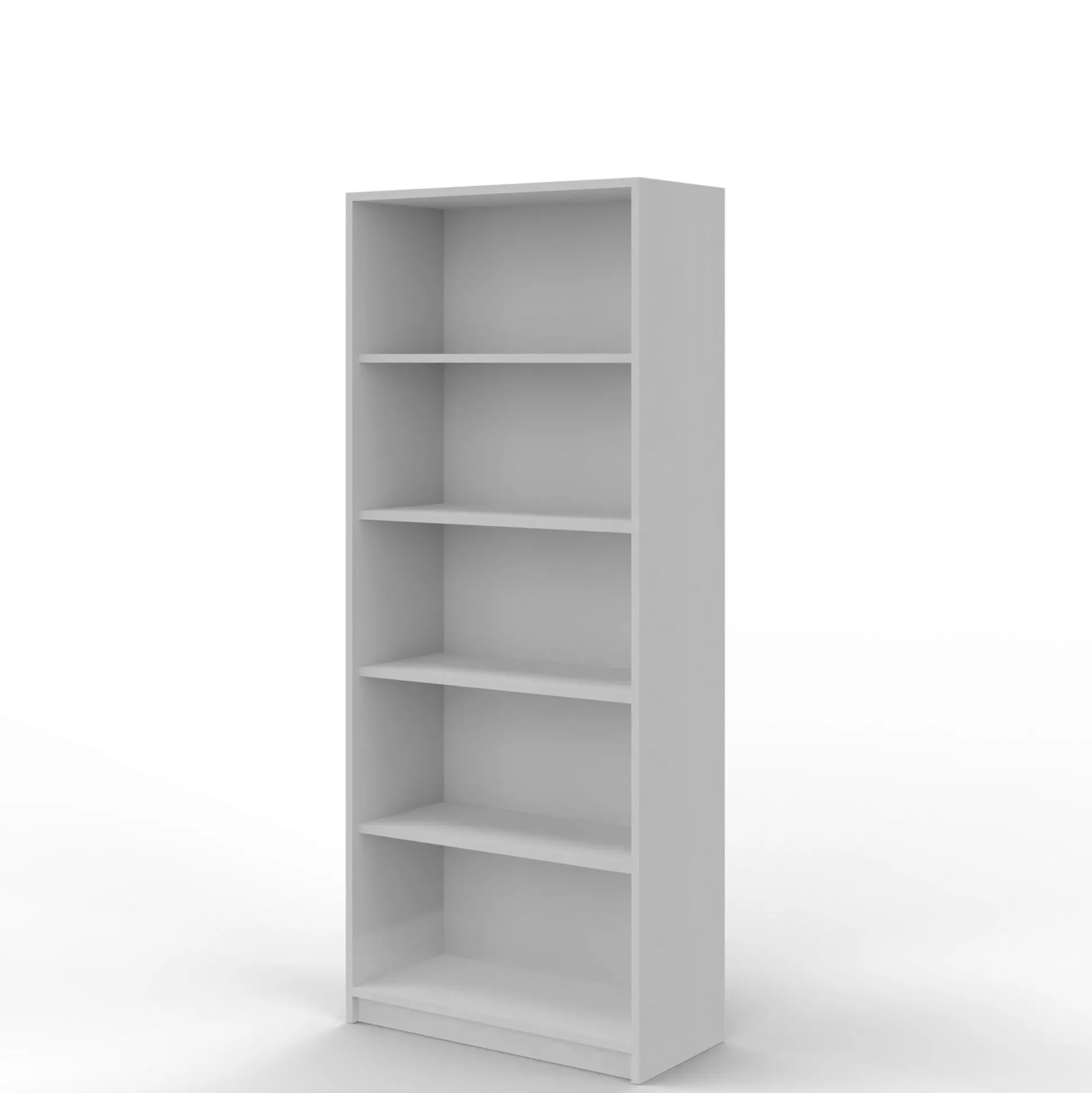 Den viste reol fås i flere farver og er lavet i enten slidstæk decor laminat eller naturligt træfinér. Den er 5 rum høj og med integreret sokkel.
