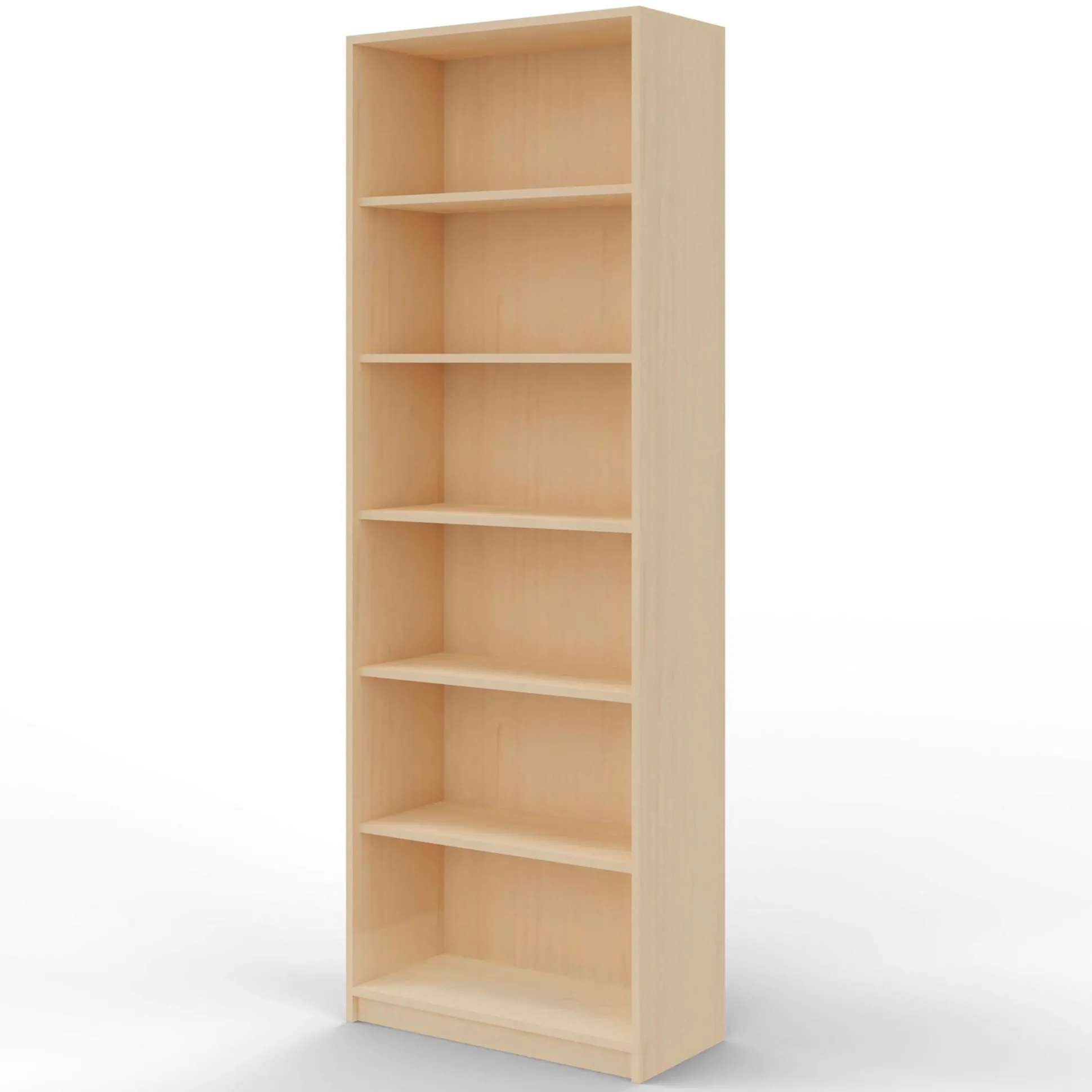 Den viste reol fås i flere farver og er lavet i enten slidstæk decor laminat eller naturligt træfinér. Den er 6 rum høj og med integreret sokkel.