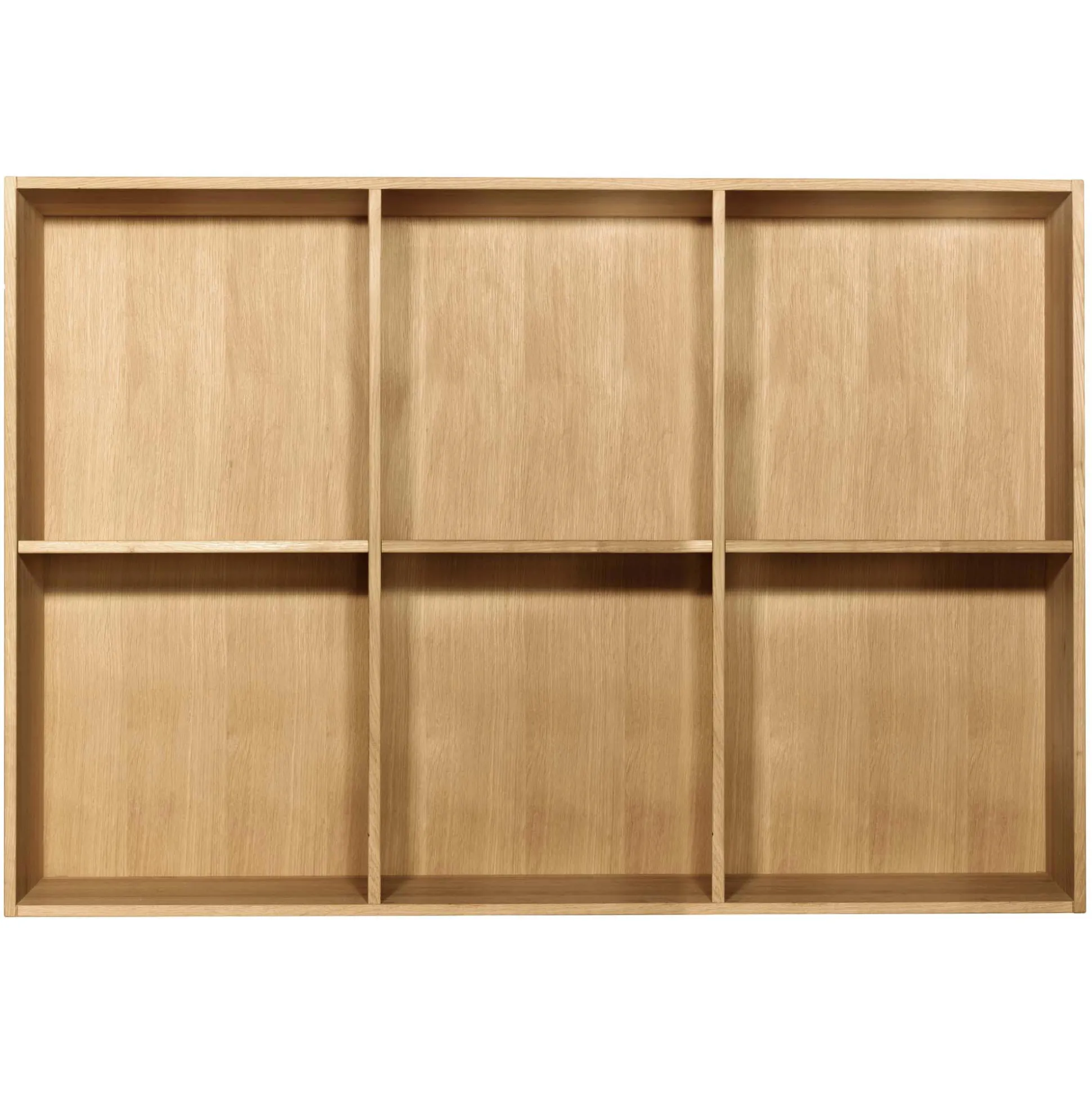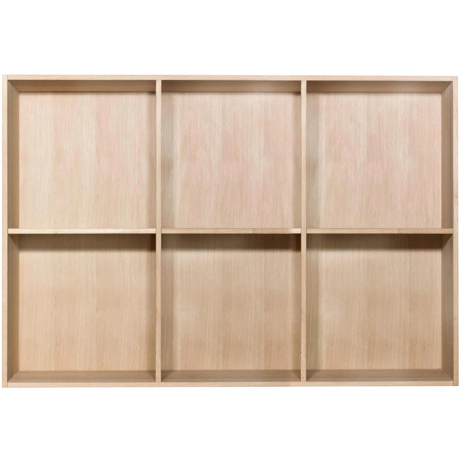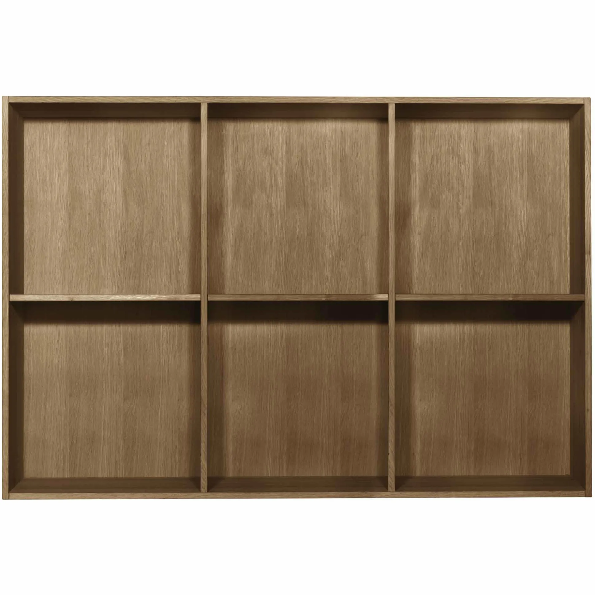 Elegant kontorreol i flot massiv eg. Reolen er fingertappet massiv eg og har 2×3 rum med tre flytbare hylder. Reolen kan hænges direkte op på din væg. Reolen leveres samlede. Kontorreolen har en dybde på 34 cm, hvilket betyder at den passer perfekt til A4 ringbind.