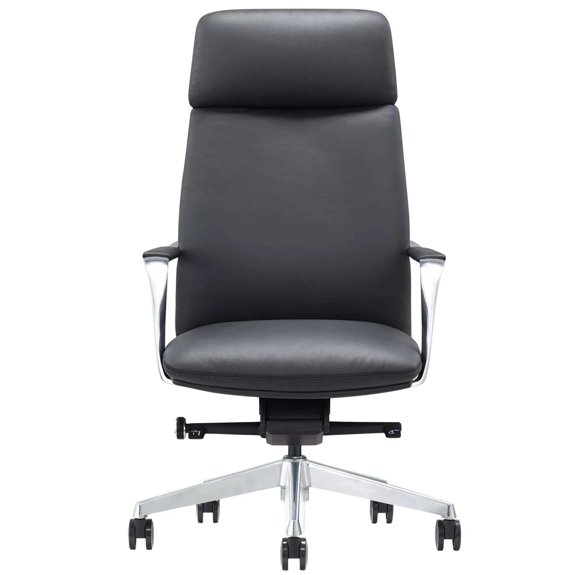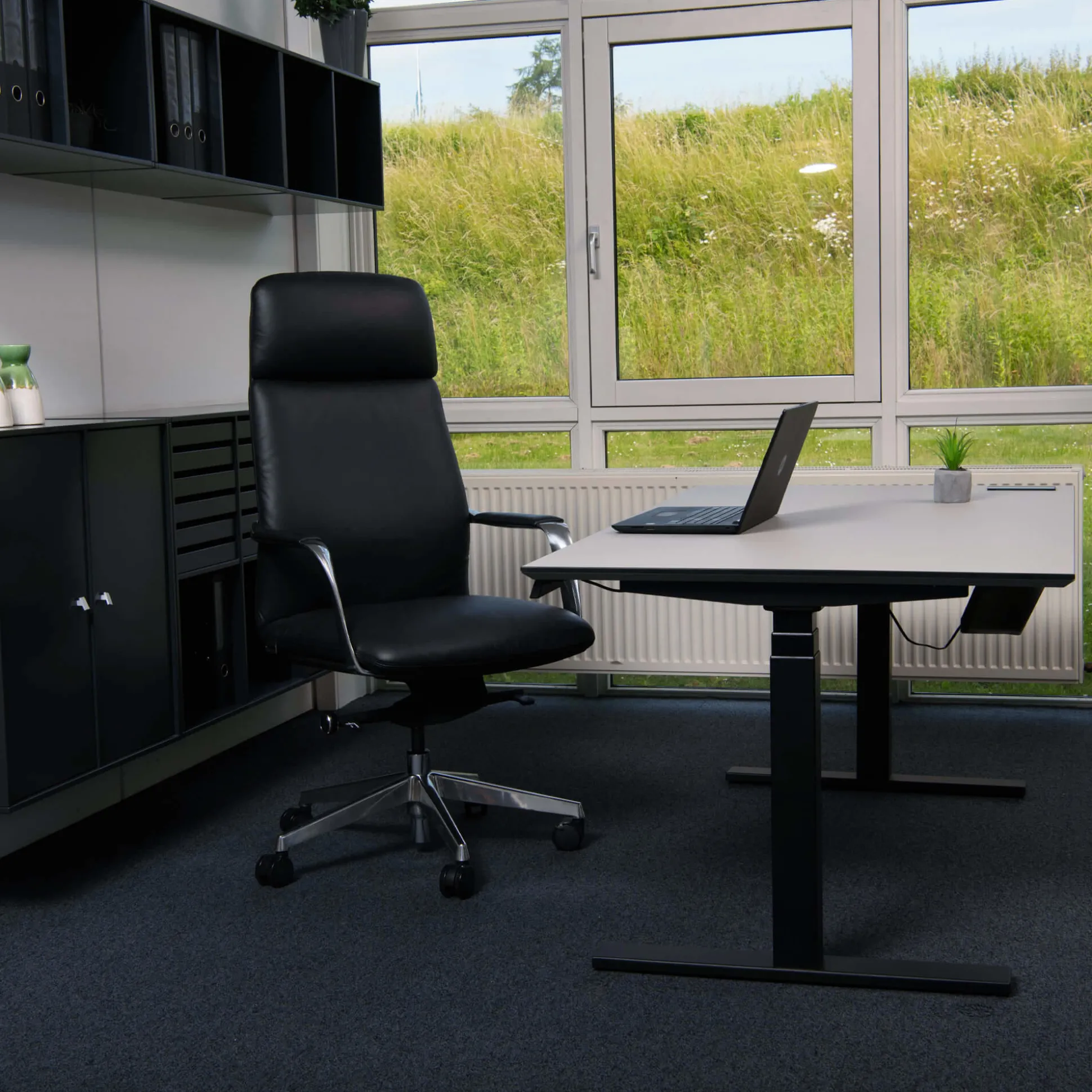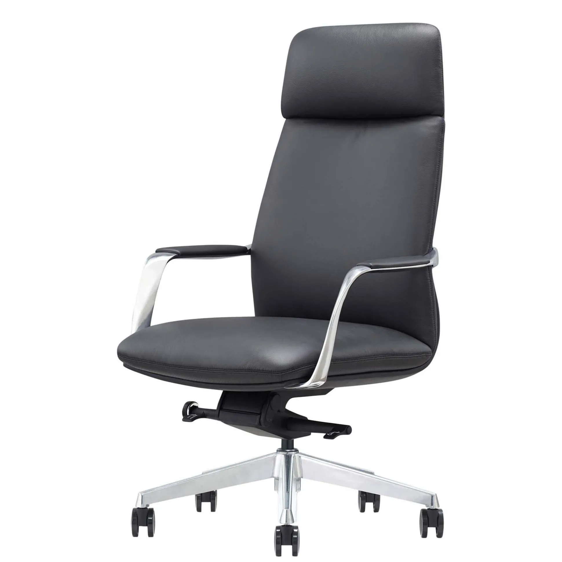 Bonea chefstol i sort ægte læder. Inkl. svungne armlæn med beklædt top og nakkestøtte. Poleret aluminiumsstel. Siddehøjde: 47-57 cm. Højdejustering og låsbart vip.