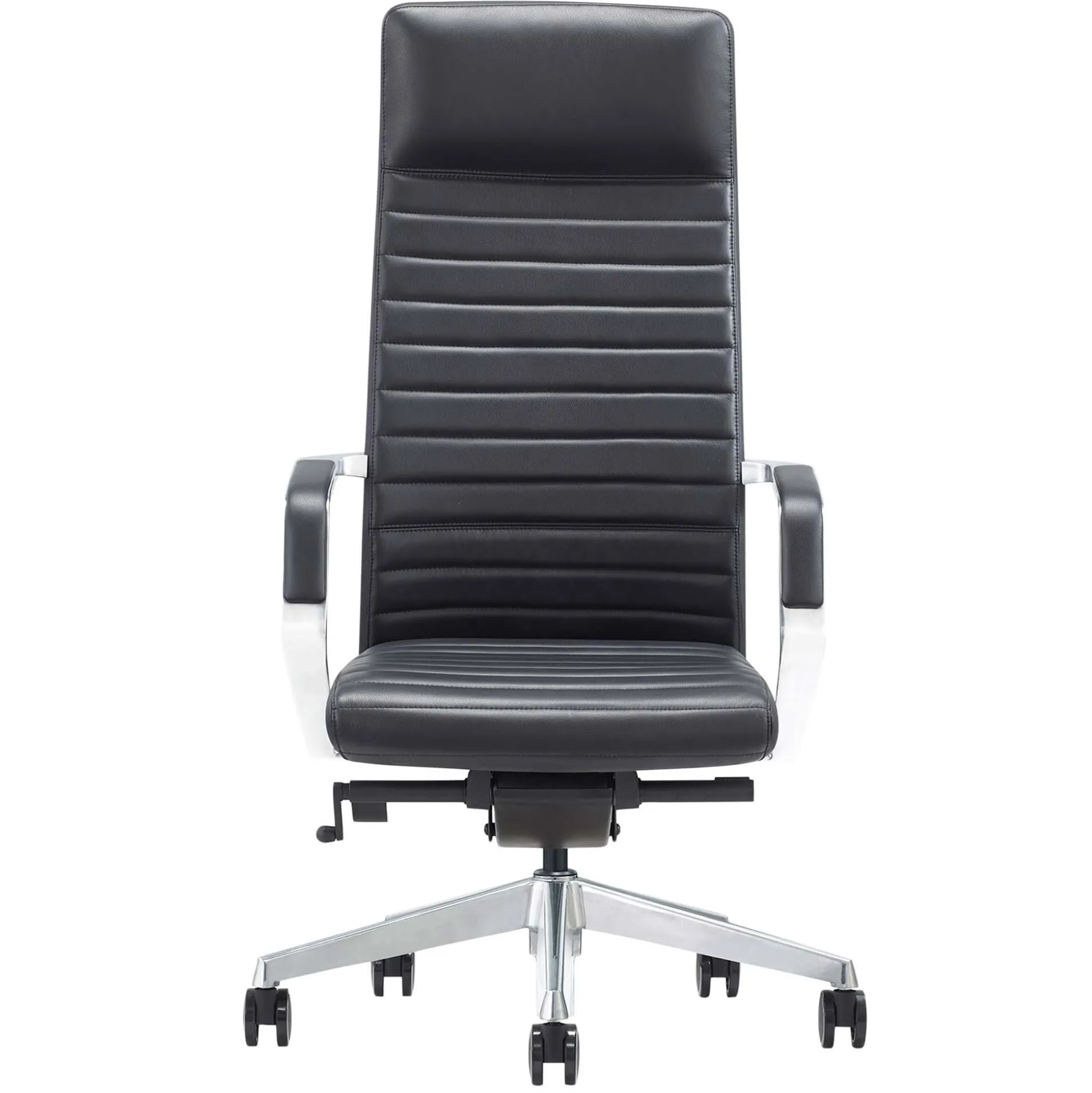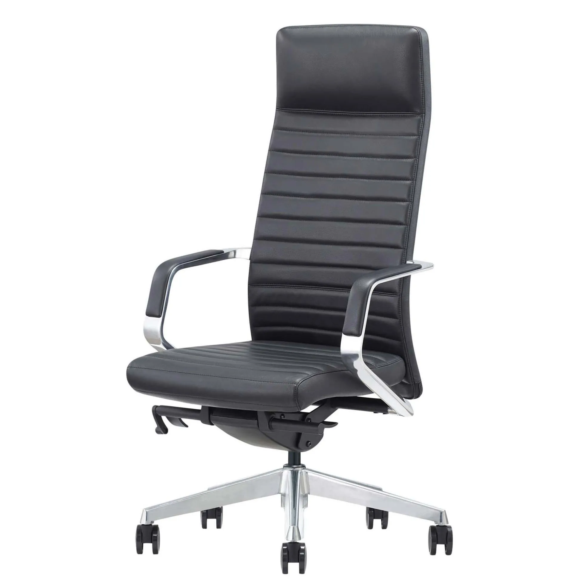 Detaljerne med armlæn og stel i poleret aluminium giver et eksklusivt look. Sammen med det lidt blanke, strækfaste, slidstærke og grovkornet sorte læder er Excellence en chefstol som gør indtryk. De polstrede armlænstoppe gør det behageligt at hvile armene.