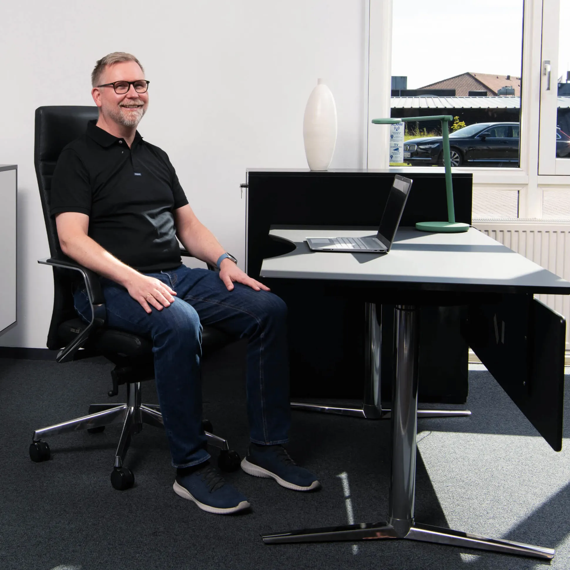 - Betræk: sort ægte læder.