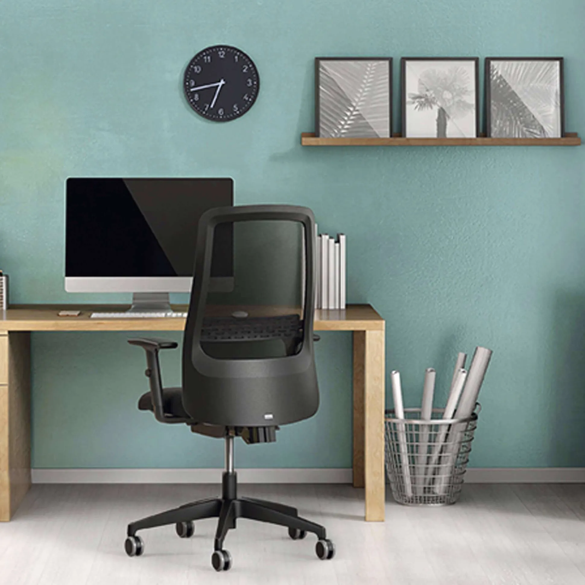 Stolen er betrukket med grafitsort Manhattan(genanvendt polyester) som slidstærkt. Nettet er ensfarvet (8140). Den har bløde hjul, til hårde gulve.