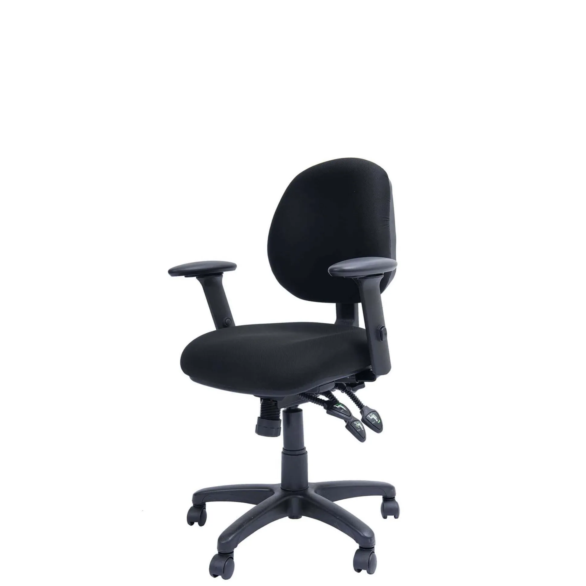 Stolen er inklusiv multifunktionsarmlæn med højdejustering og dybdejustering. Med sort fodkryds og sort betræk. Armlæn kan man undlade at montere.