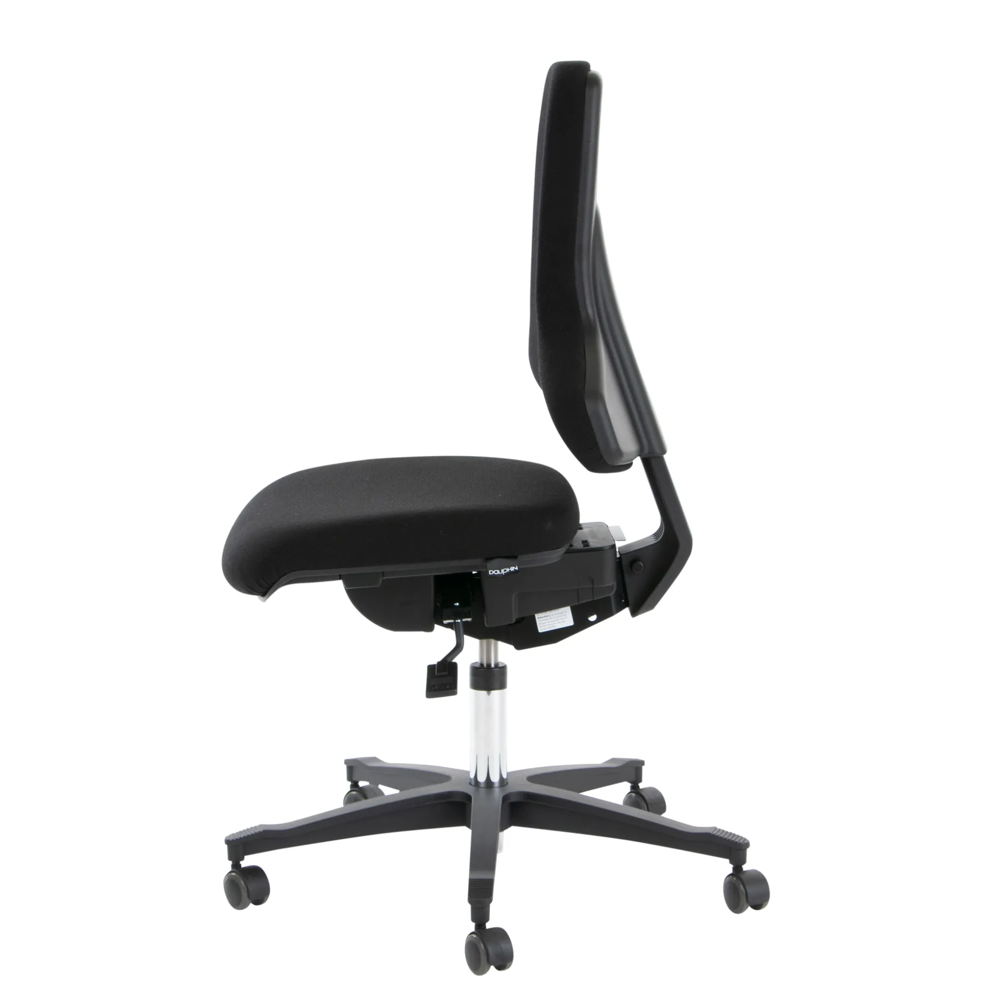Dauphin Tec Profile IS 20270 kontorstol sort Fame stof. Siddehøjde 49-65 cm. Højdejusterbar ryg, med trinløst ryglænsmodtryk. Den smalle ryg giver stor bevægelsesfrihed, til arme og skuldre. Samtidig er der fokus på en god lændestøtte. Stolen har Syncro-Activ-Balance, som stimulerer at brugeren holder rygsøjlen rank.