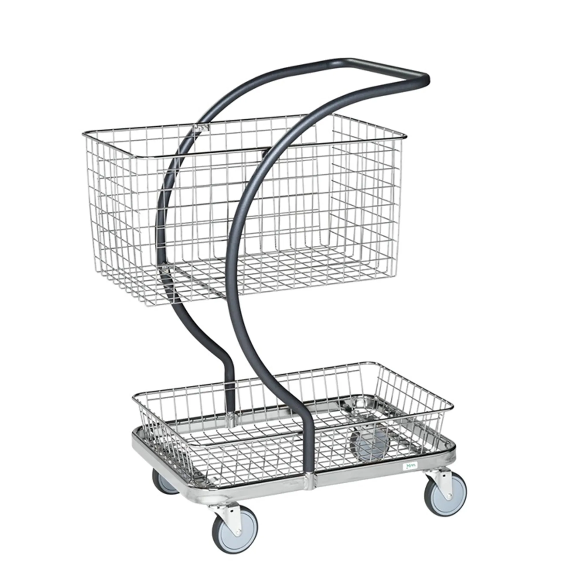 Kurvevogn C-line til opfyldning. Med en stor kurv og en lav bundkurv. Perfekt til vareopfyldning i butik, til transport af smådele i virksomheden, som kundevogn og meget meget mere. Belastning: 70kg. pr. hylde, total 140 kg. 4 drejelige hjul. Hyldemål: L59,5 x B36 cm. Hyldeafstand: 38 cm. Højde til første hylde: 16 cm.
