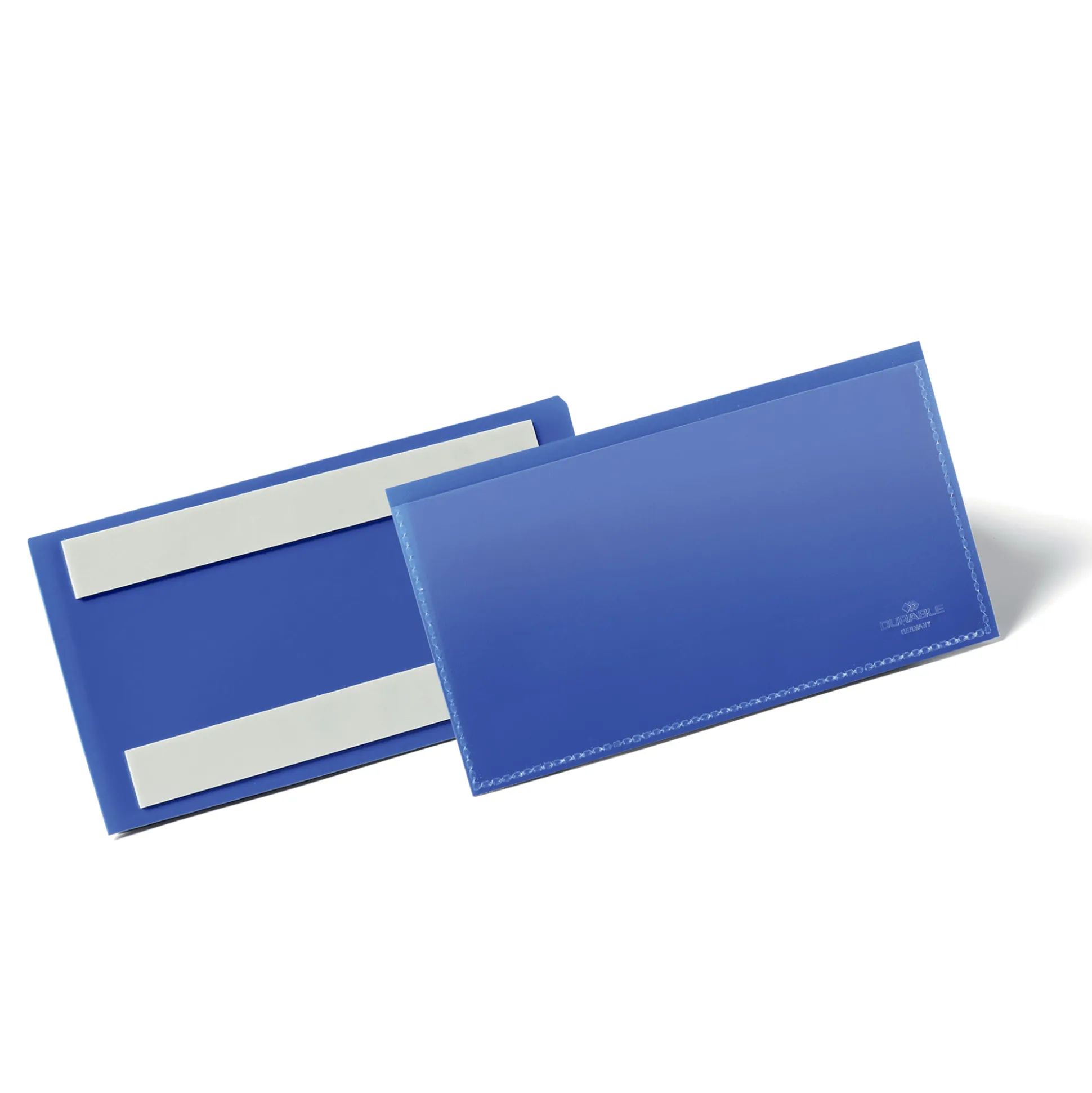 Lagerlomme /etiketholder med blå bagside med selvklæbende strips og gennemsigtigt vindue lavet af heavy-duty polypropylen. Brug på alle overflader, såsom metal, karton og plast. Rivefast og velegnet til scannere. Indhold kan udskiftes hurtigt. Gratis skabeloner til etiketter fås fra www.duraprint.eu. Indvendige mål: 150 x 67 mm (B x H) Udvendige mål: 163 x 83 mm (B x H)