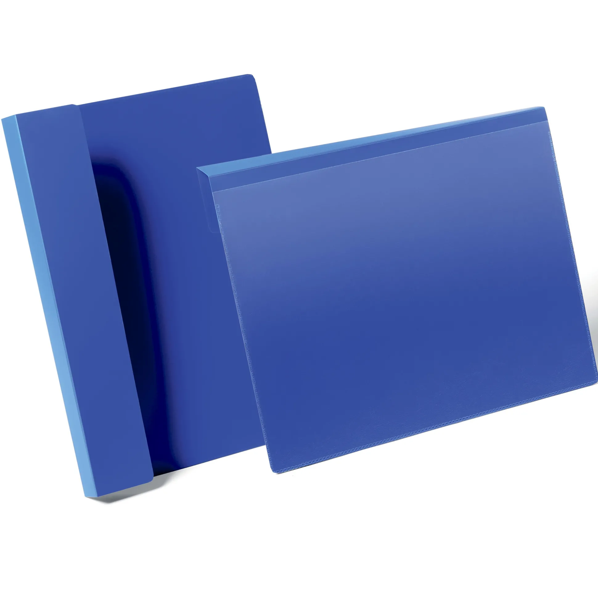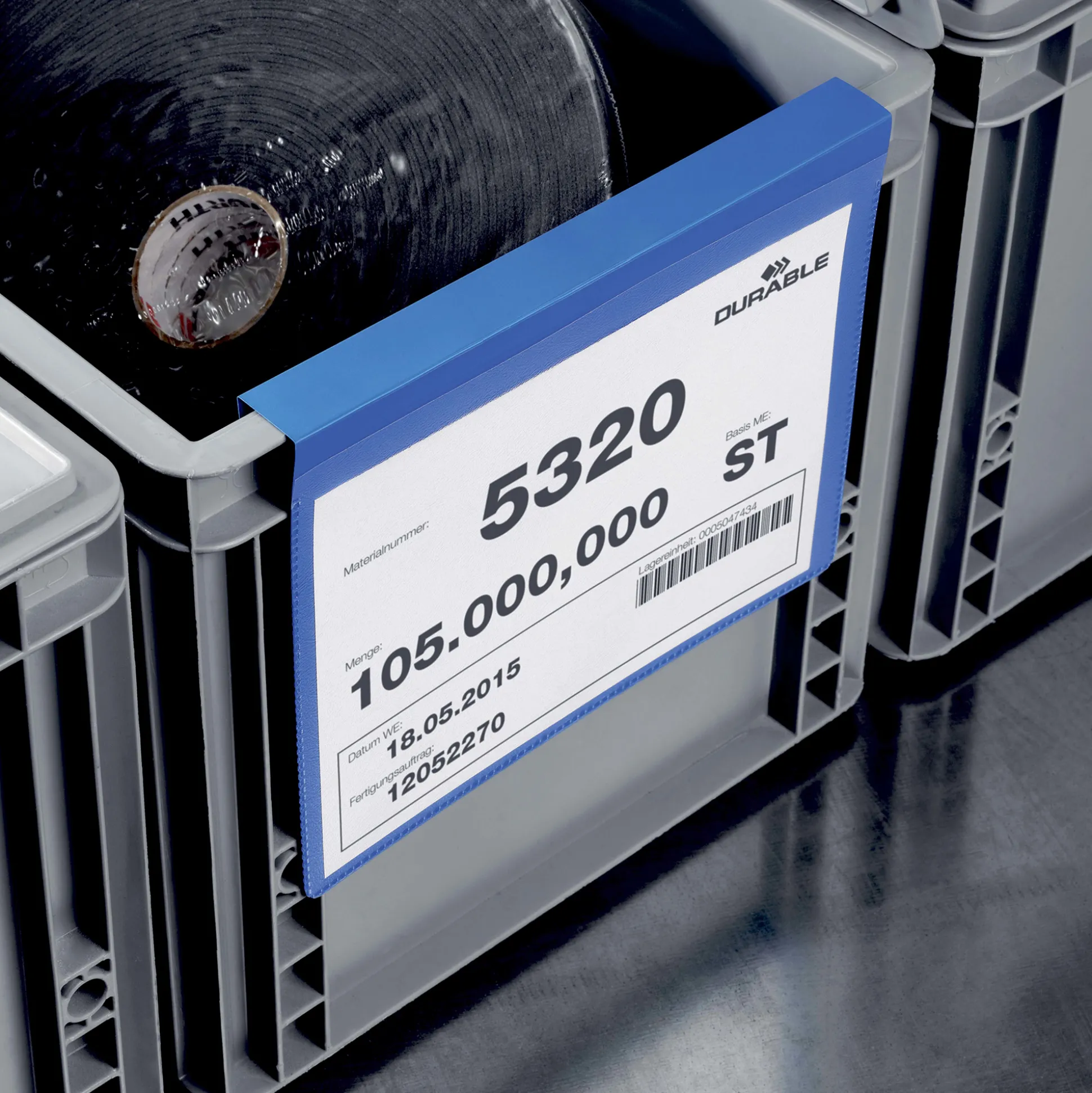 Hængende lageromme til mærkning af paller og kasser. Indsæt mellem stablede kasser eller fold det øverste af lommen og lad den hænge ud over pallekanten. De slidstærke lagerlommer har blå bagside og gennemsigtig frontlomme som giver nem mulighed for indførelse og udskiftning af etiketter. Velegnet til brug med scannere Træbestandig. Download af skabelon til indstiketiketter er tilgængelige på www.duraprint.eu. Indermål A4L (297 x 210 mm B x H) Ydermål: 317 x 321 mm B x H