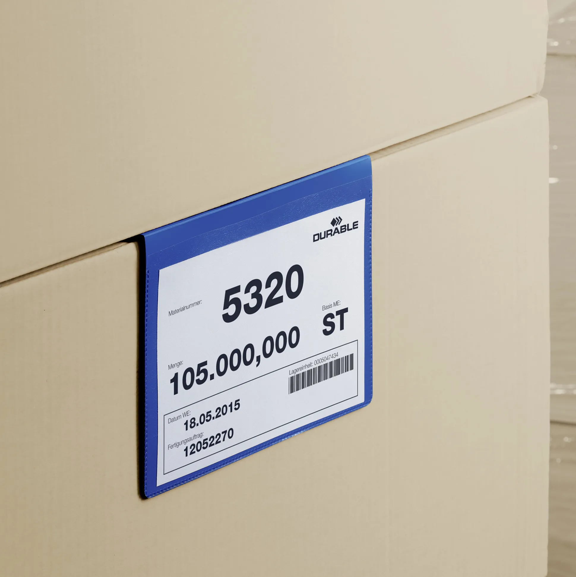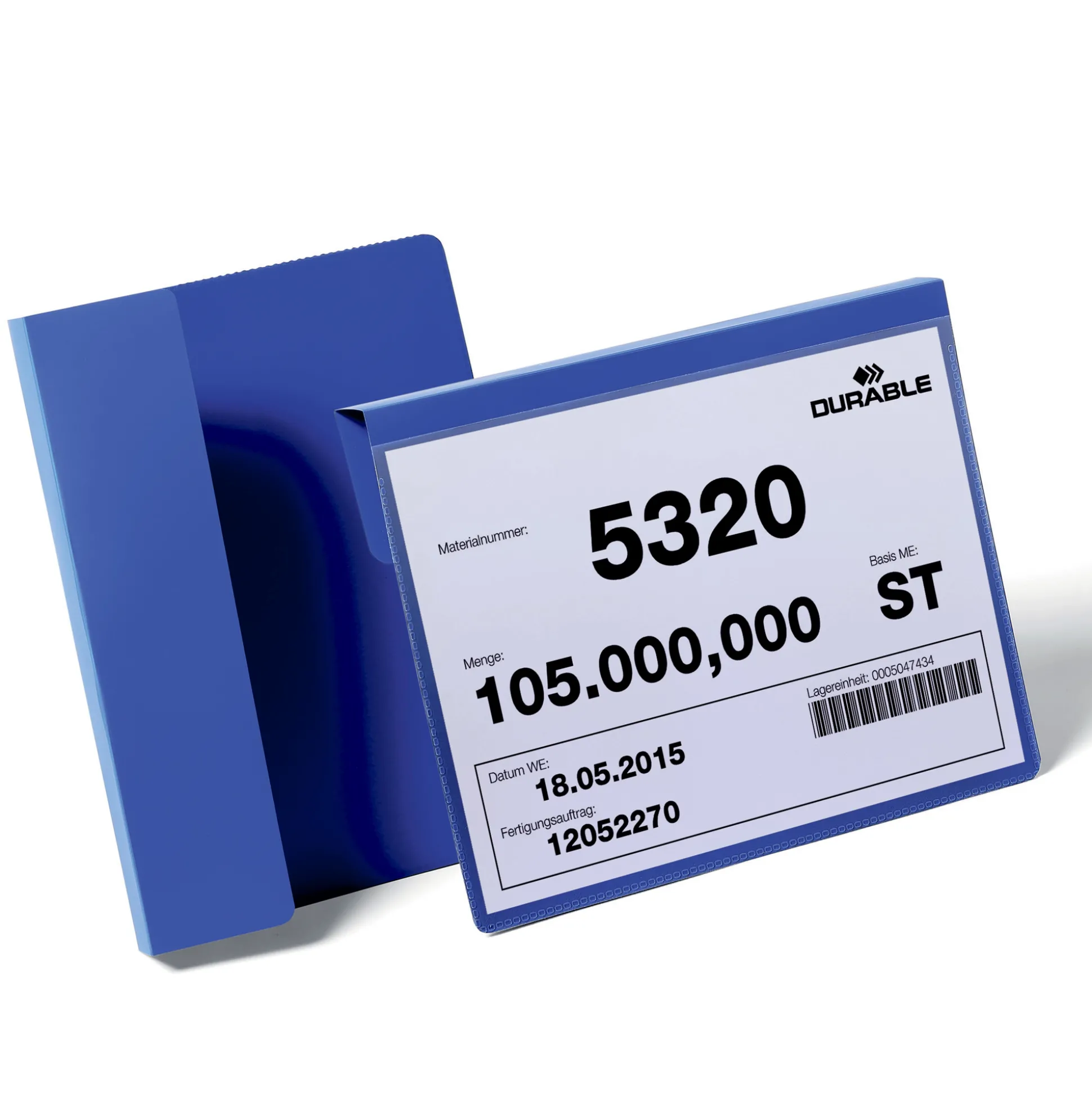 Hængende lagerlomme til mærkning af paller og kasser. Indsæt mellem stablede kasser eller fold det øverste af lommen og lad den hænge ud over pallekanten. De slidstærke lagerlommer har blå bagside og gennemsigtig frontlomme som giver nem mulighed for indførelse og udskiftning af etiketter. Velegnet til brug med scannere Træbestandig. Download af skabelon til indstiketiketter er tilgængelige på www.duraprint.eu. Indermål: A5L (210 x 148,5 mm B x H) Ydermål: 259 x 230 mm B x H
