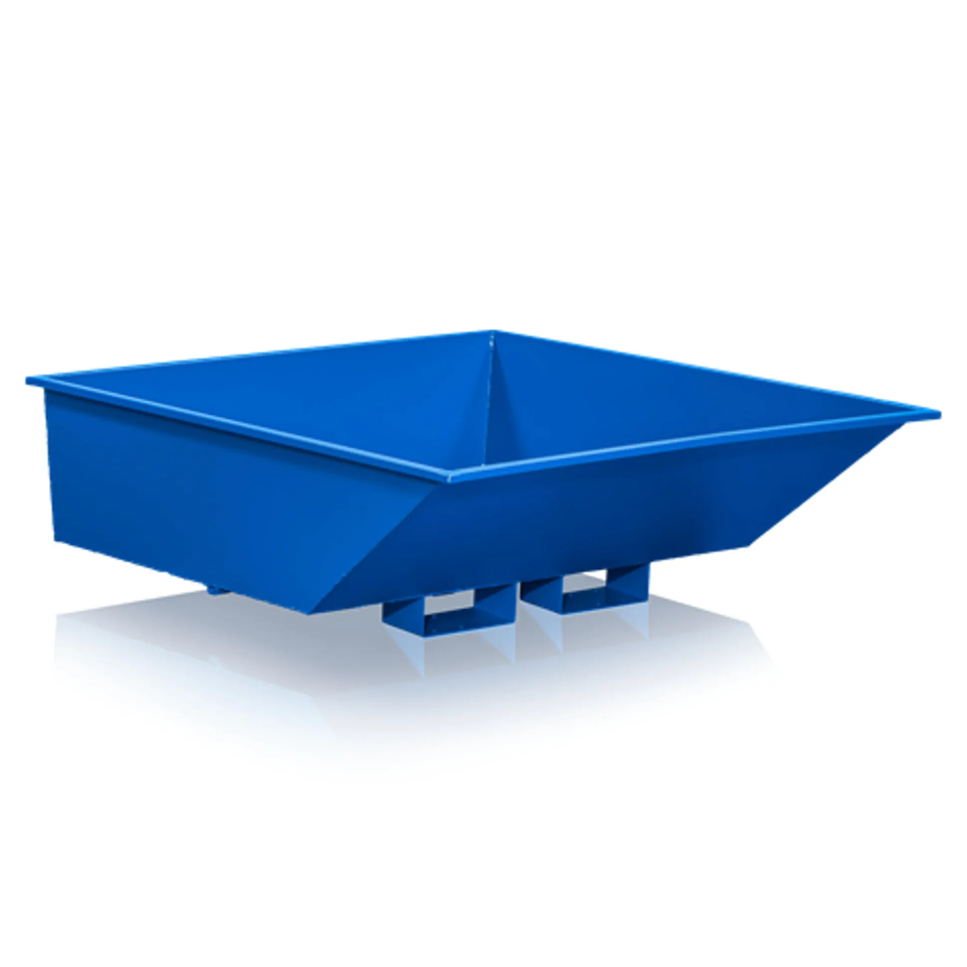 Lav tipcontainer med gaffellommer. 750 liter. Let tømining med truck. Til brug for arbejdssituationer, hvor højden spiller en rolle. Automatisk tømning ved hjælp af fjederbelastede trykplade på bunden, så truckføren kan sidde sikkert i trucken. Ring og hør om fragtforhold.