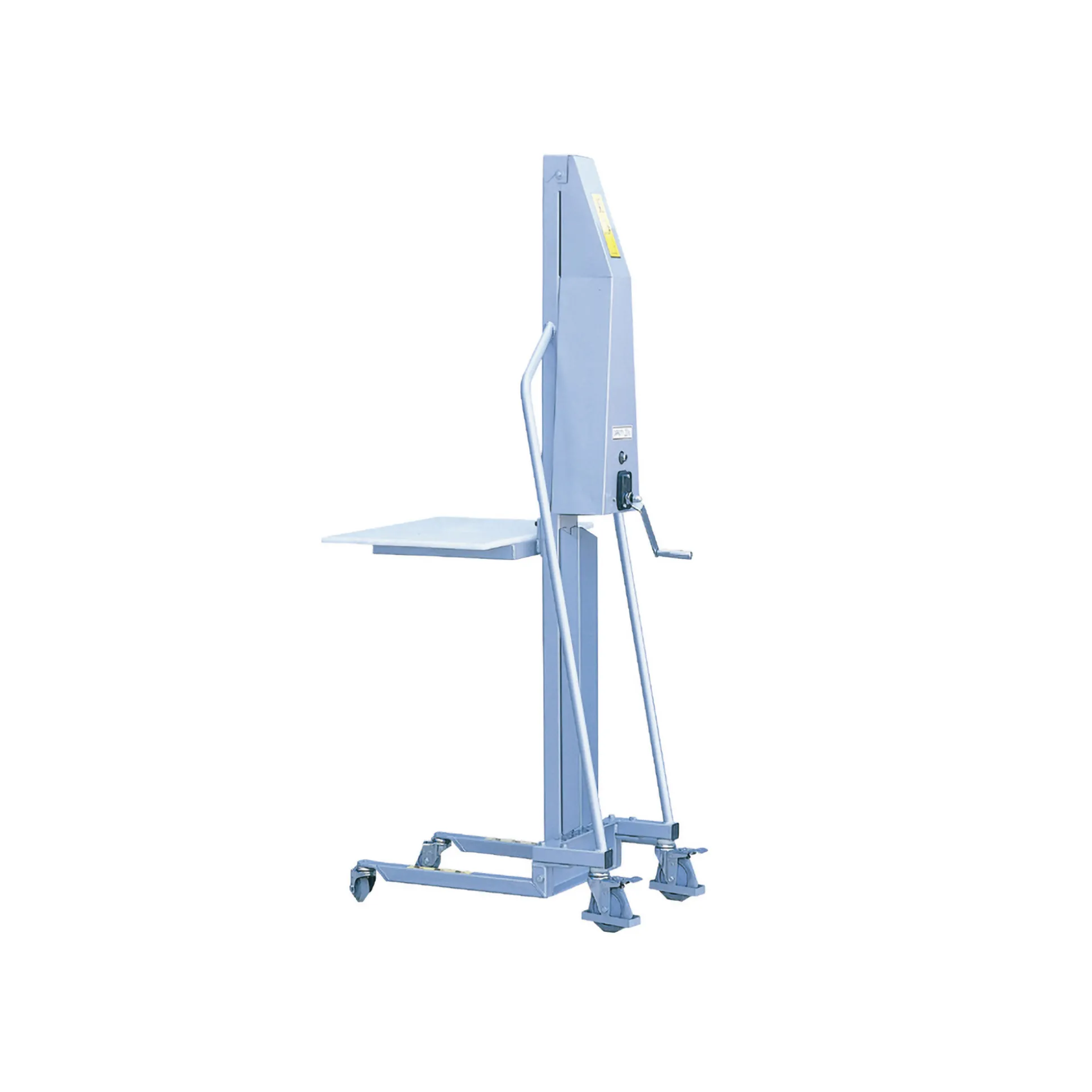 Mini-stabler, der betjenes med håndsving og stål-wire som giver en nøjagtig løfte/sænkefunktion. Lasteevne: 100 kg. Løftehøjde: 13-150 cm. Platformmål: 47×60 cm.