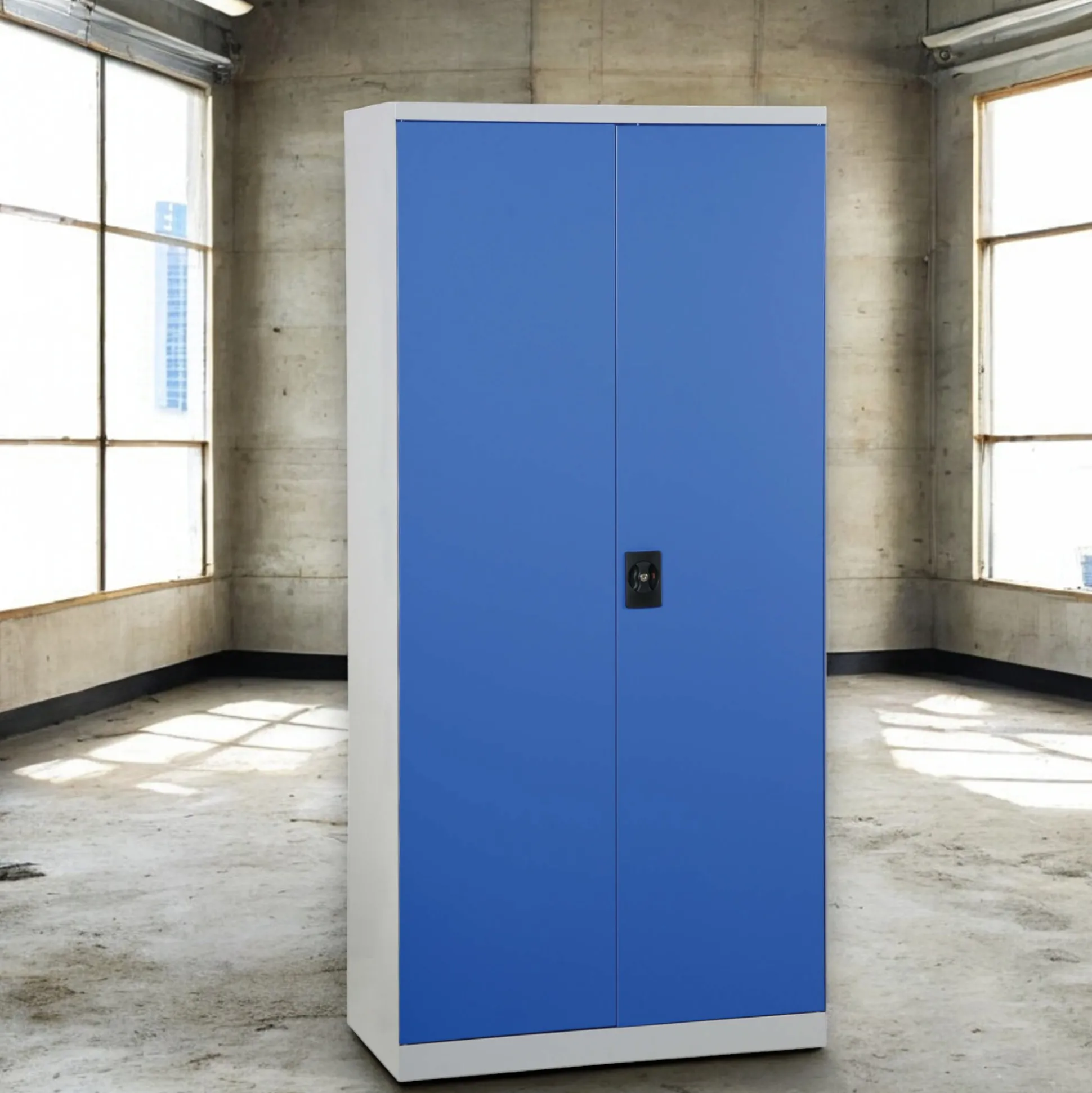 Materialeskab m/4 hylder. Blå låger og gråt kabinet. Mål: 1800H x 850 B x 390D mm. Skabet leveres usamlet. Stålskab med cylinderlås. Max. belastning pr. hylde: 50 kg, jævnt fordelt. Samlet max. belastning: 250 kg.