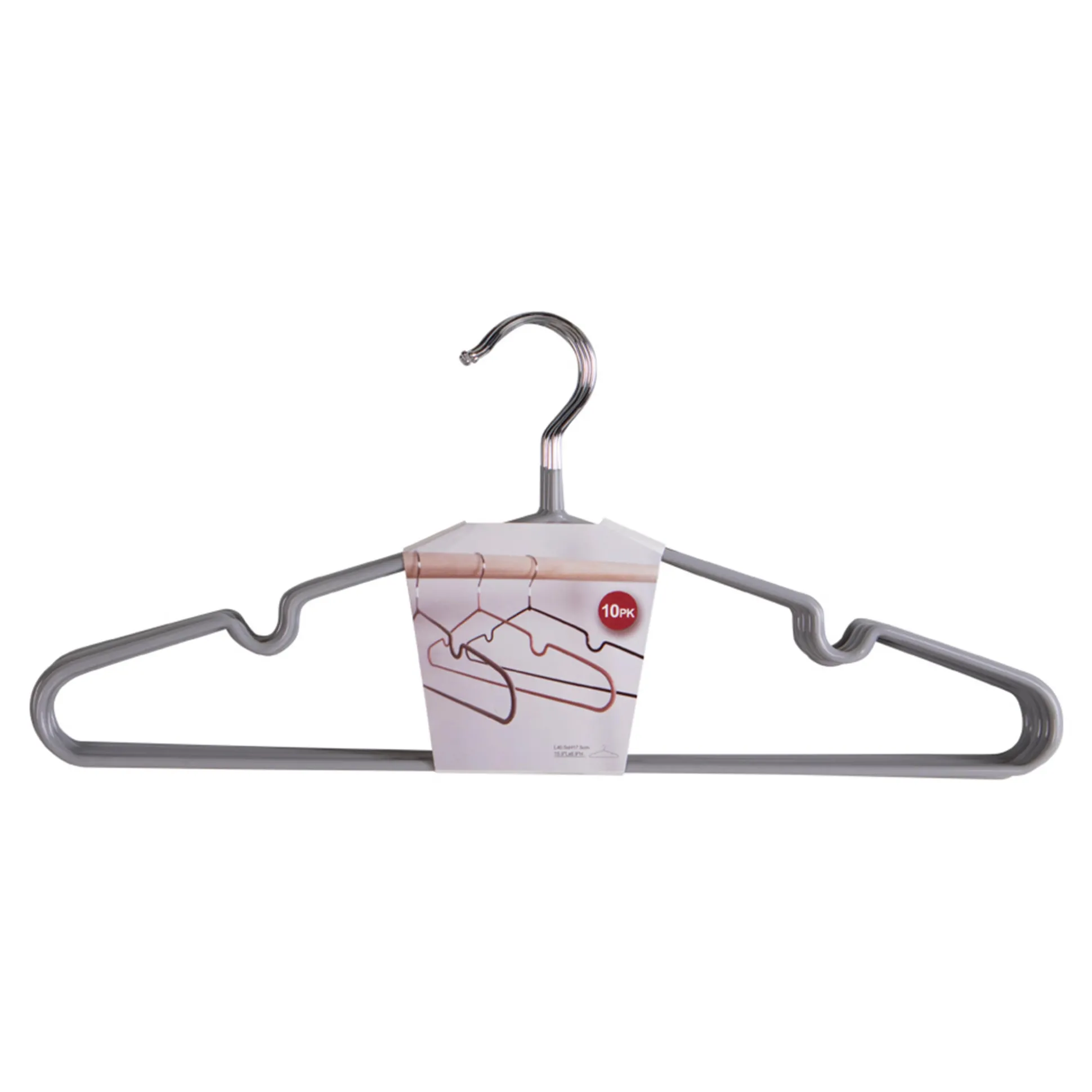 Dette sæt af 10 metalbøjler med grå belægning kombinerer holdbarhed med et elegant udseende. Metalbøjlerne er skabt til at beskytte dine tøjstykker og tilbyde en pålidelig ophængningsløsning til dit klædeskab eller tøjstativ.