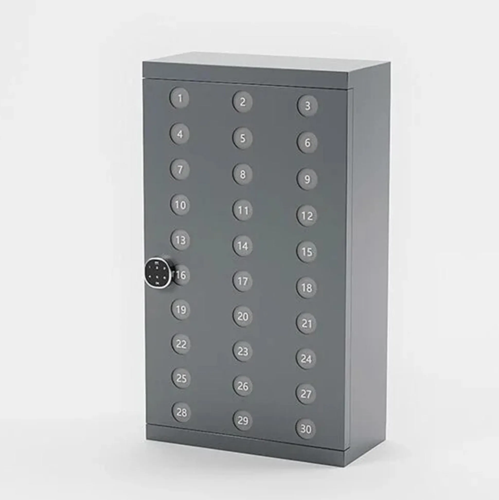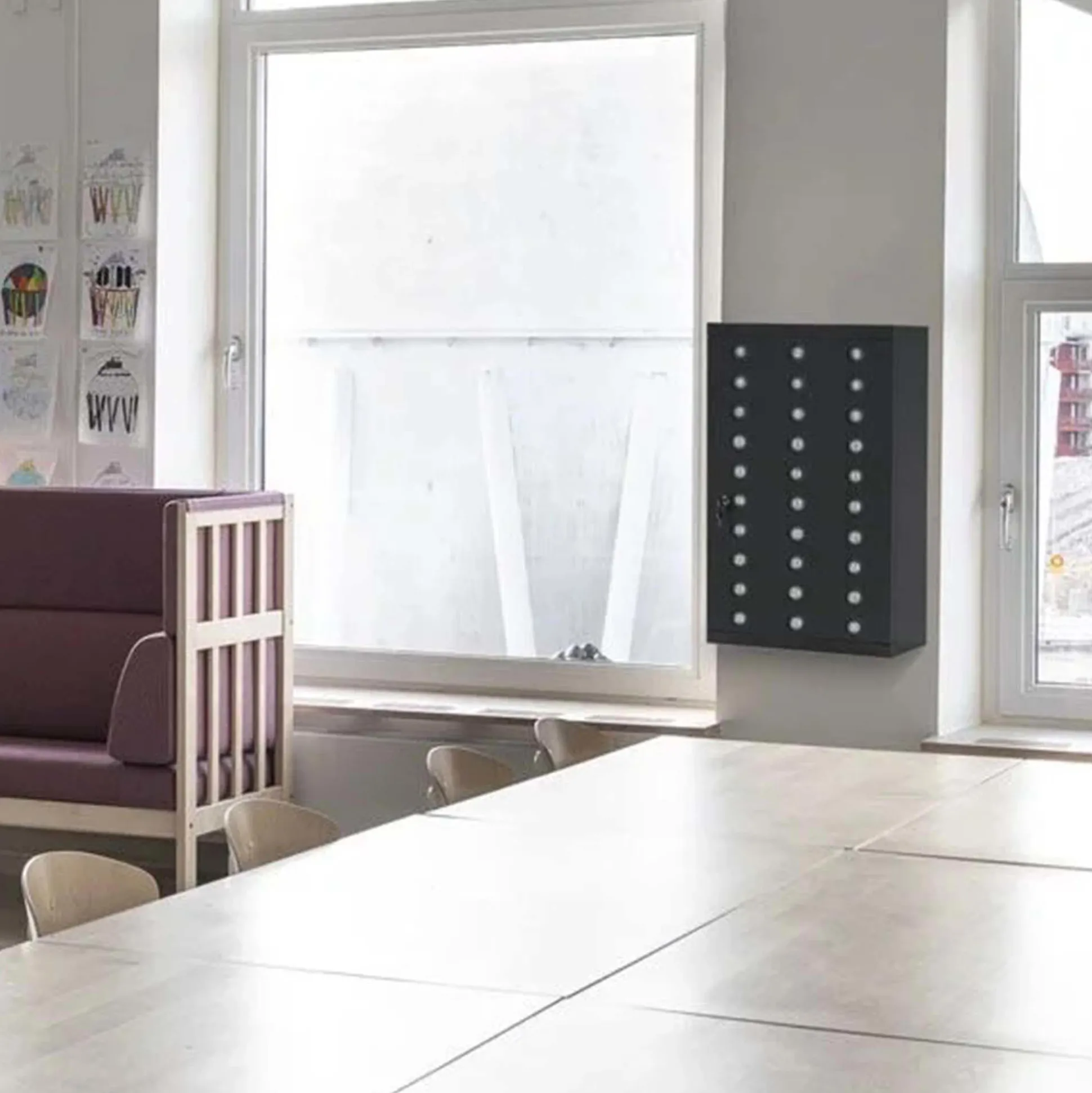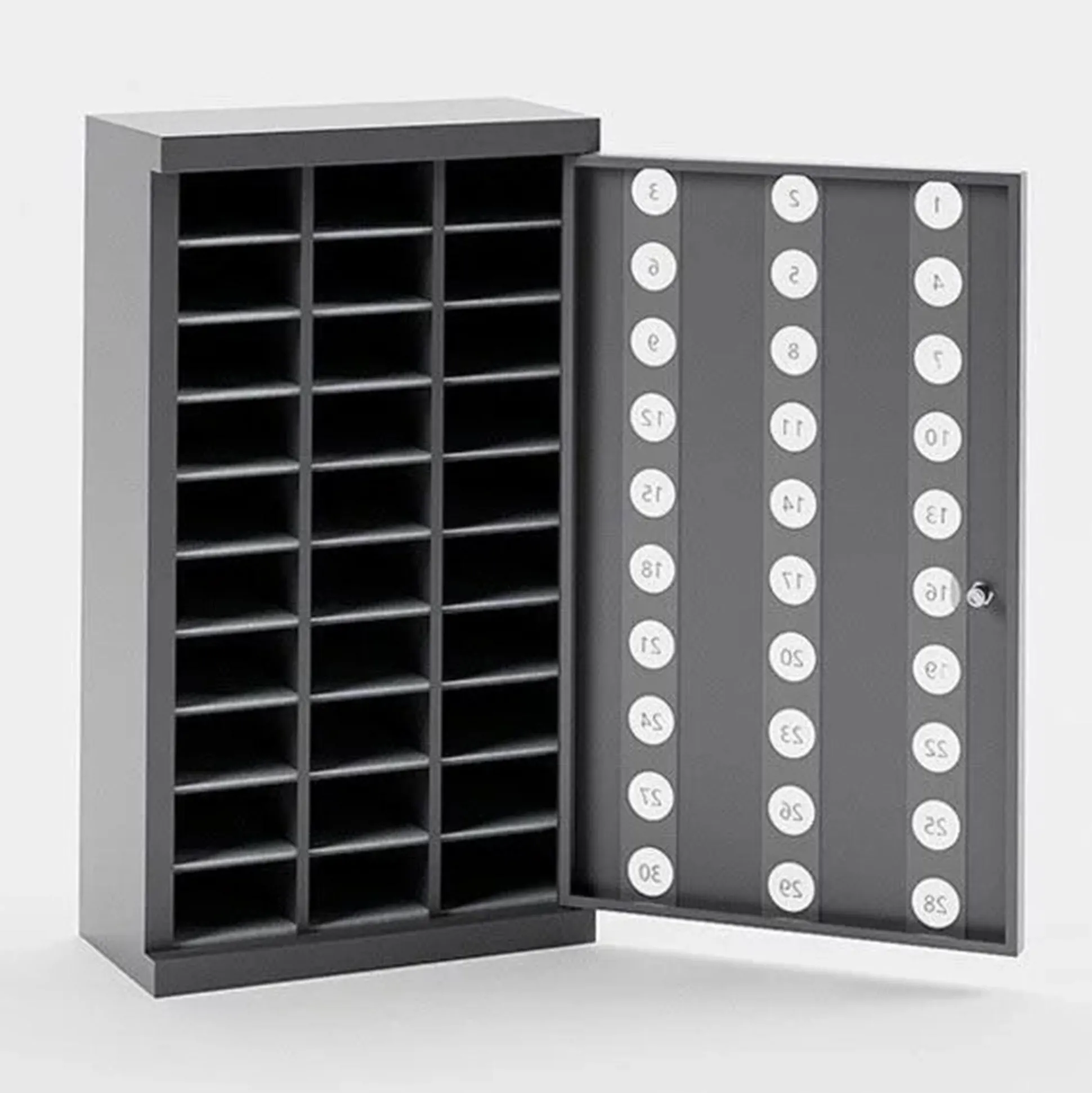 Dette mobilhotel er fremstillet i højkvalitets stål i farven mørkegrå (RAL 7024) og måler udvendigt 20x40x70h cm og hvert rum måler 20x11x6,3h cm og vejer 7 kg.